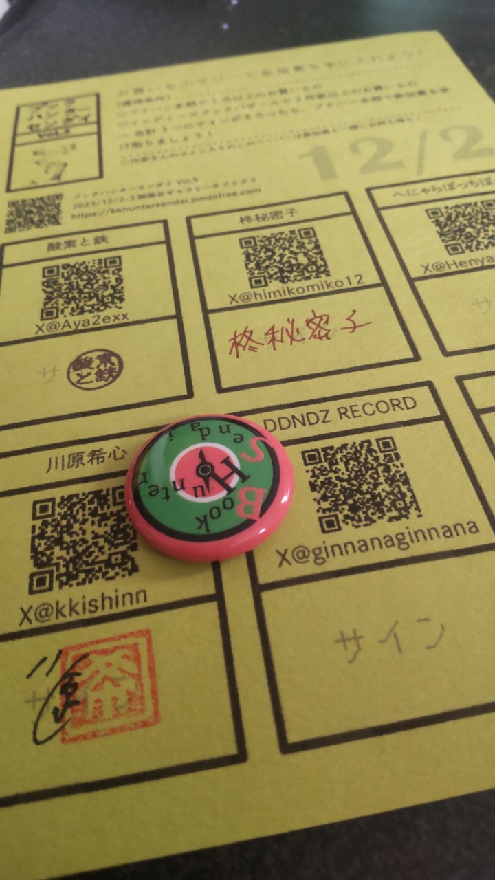 ……入り口でこのようなスタンプラリーの台紙をもらい、規定数を余裕でクリアしたので記念品を頂きました。少しずつ缶バッヂのコレクションが増えてきました。そしてスタンプラリーの台紙はそのまま、作家さんと交流をした証拠にもなります。これも含めて大切にしたいと思います。
