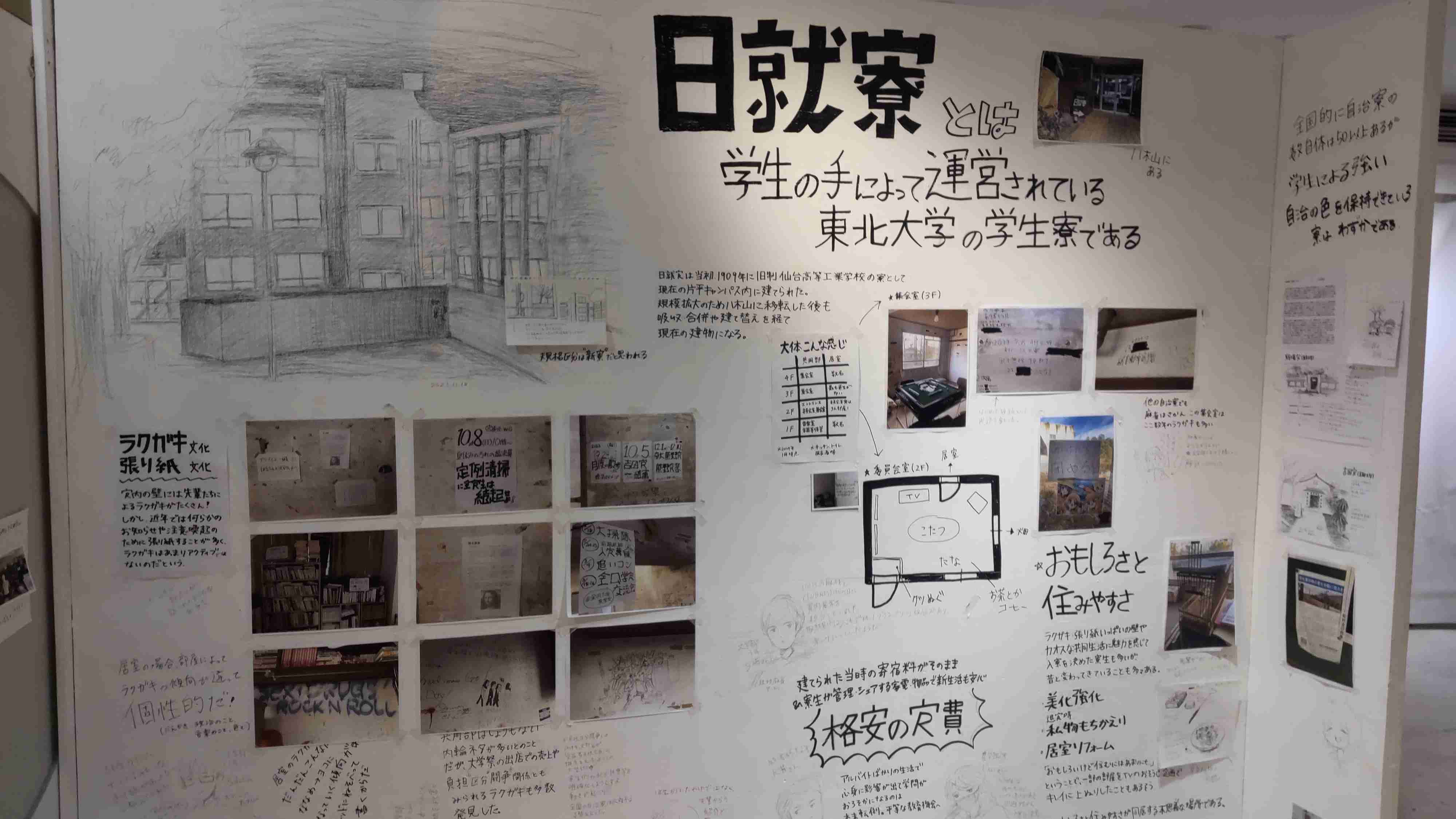 今回は東北大学日就寮の近年の暮らしや建物について寮内の「壁メディア (と勝手に呼ばせていただく)」のアウトラインをなぞる形で見聞録を制作した。正統派の編集やジャーナリズムの梯子を外した上で、壁メディアの変化や寮の位置付け、近年の暮らしのありかたを感じていただければと思う。