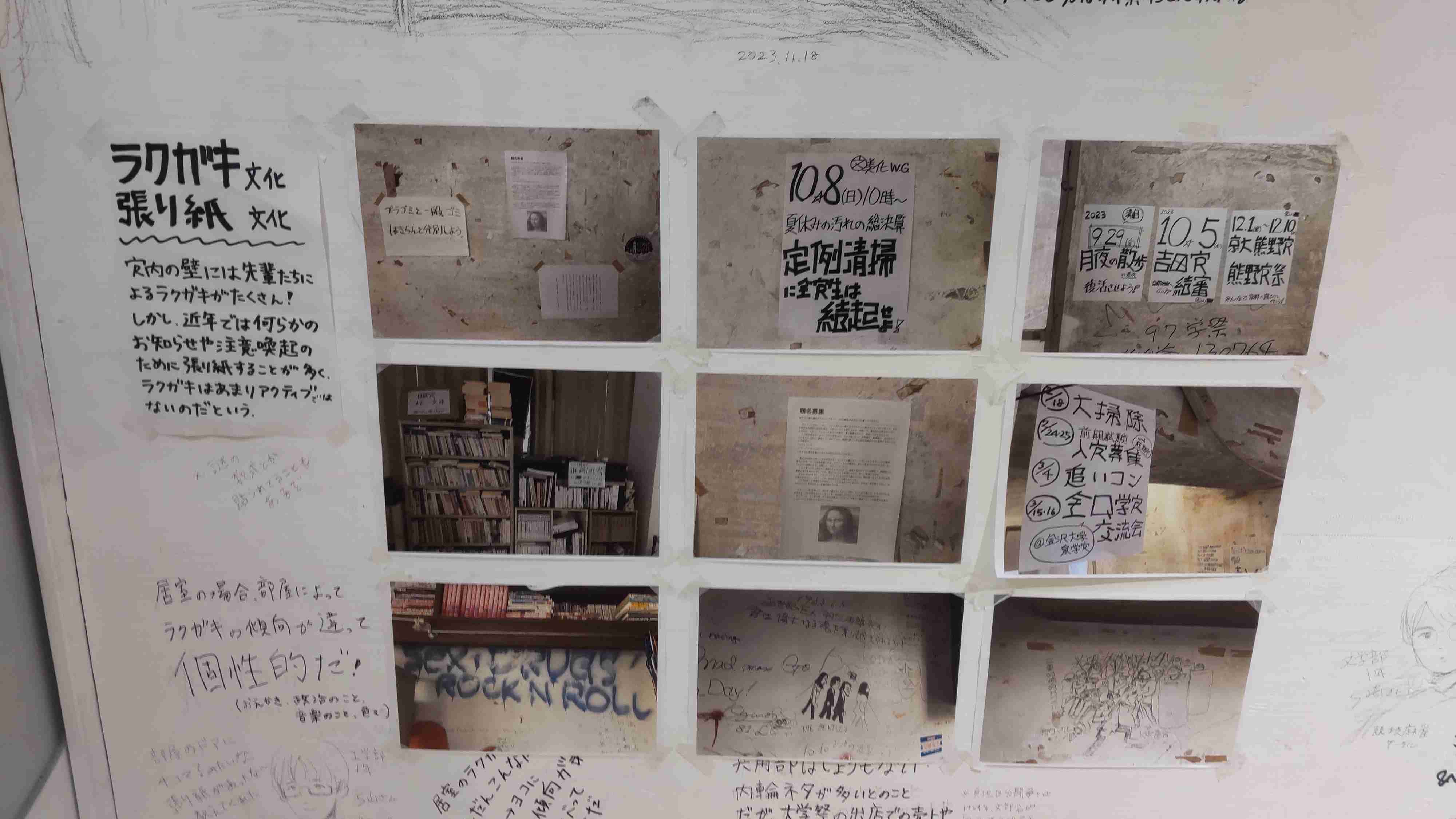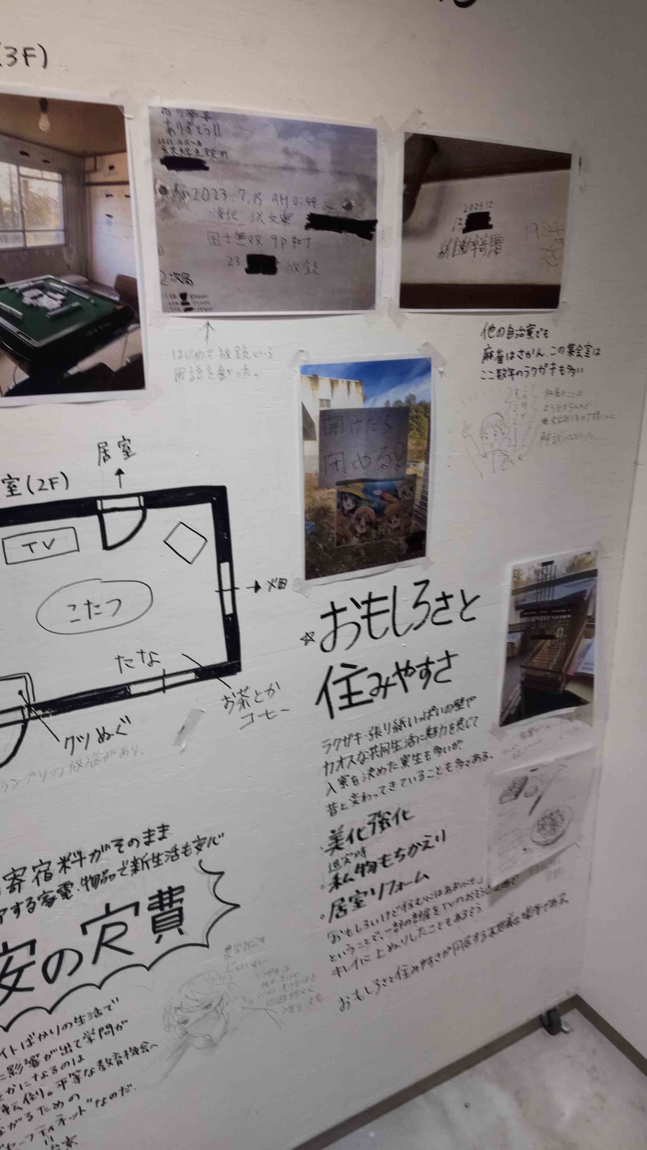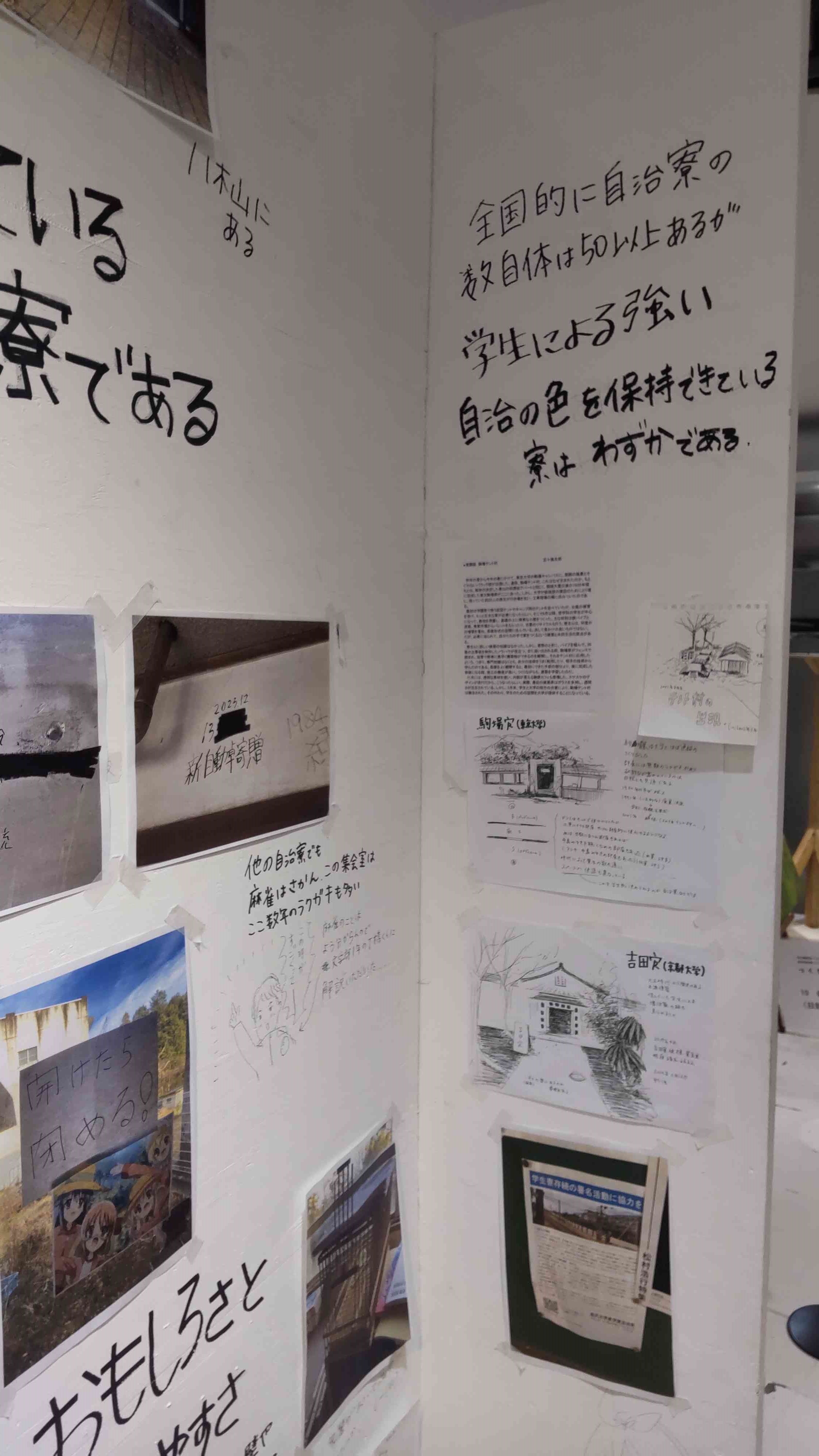 私はそんなものより、学生自治寮の壁の落書きや張り紙の方がよっぽど純粋な事実であり、本来の草野球的な市民メディアなのではないかと捉えた。クローズドではあるものの、形式にとらわれず学生生活を送る中での叫び、遊び、学びを残しておくことに純粋な美しさを感じる。その純粋さは大衆性、専門性の外側にある限界芸術のような趣がある。