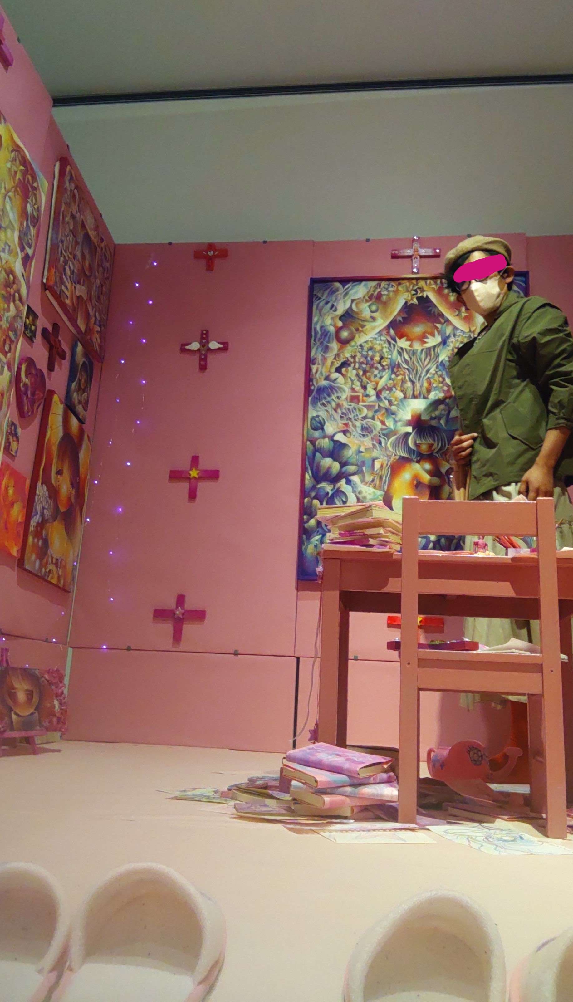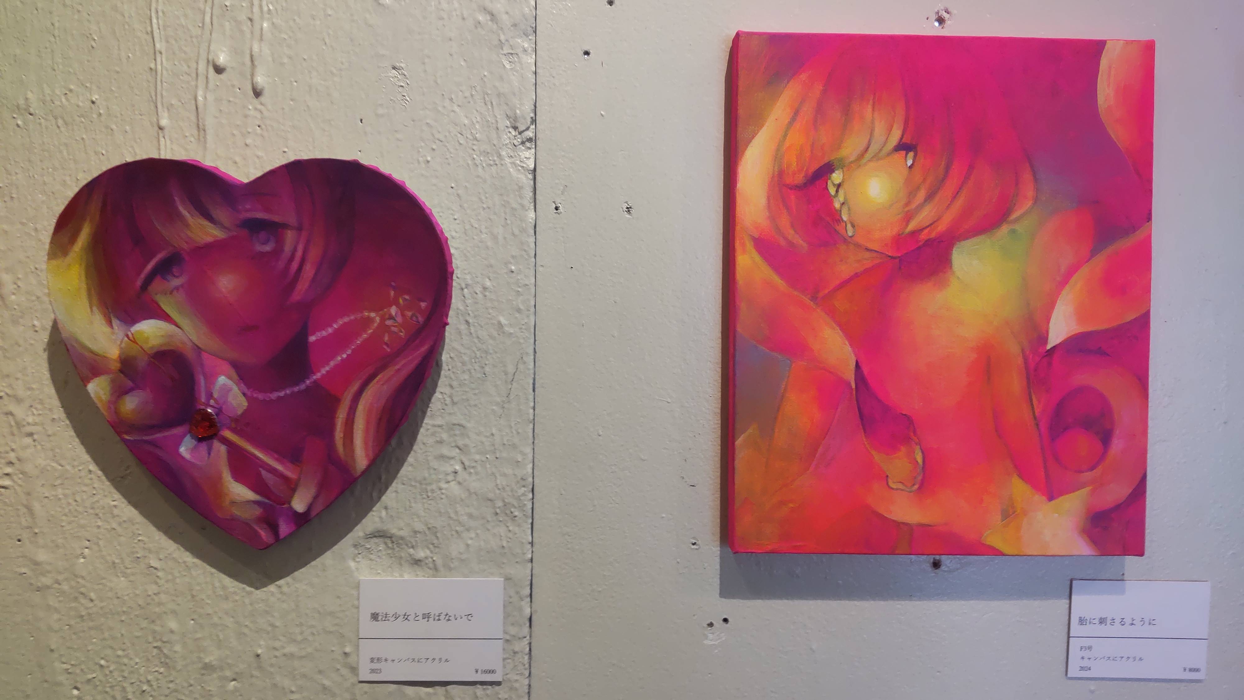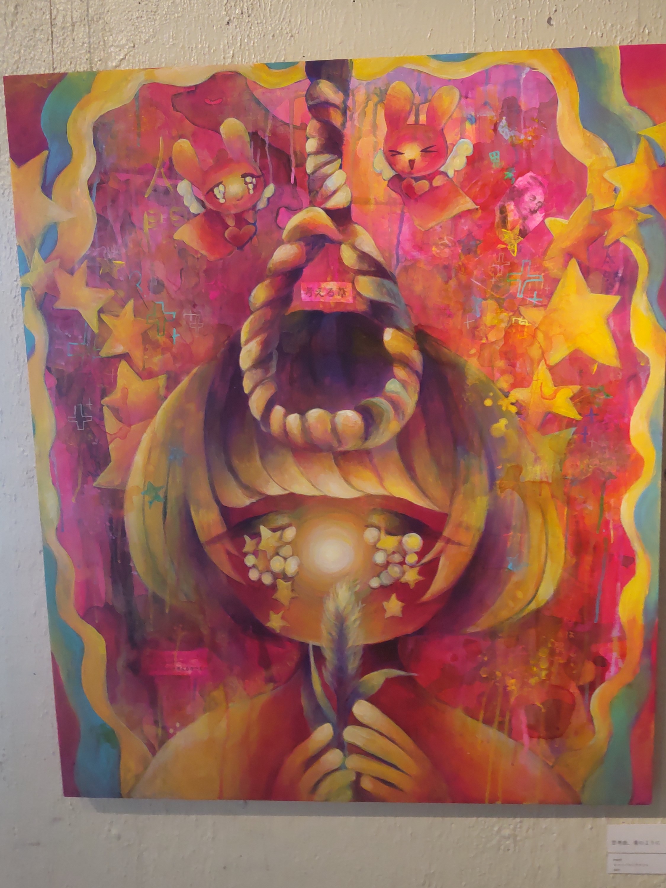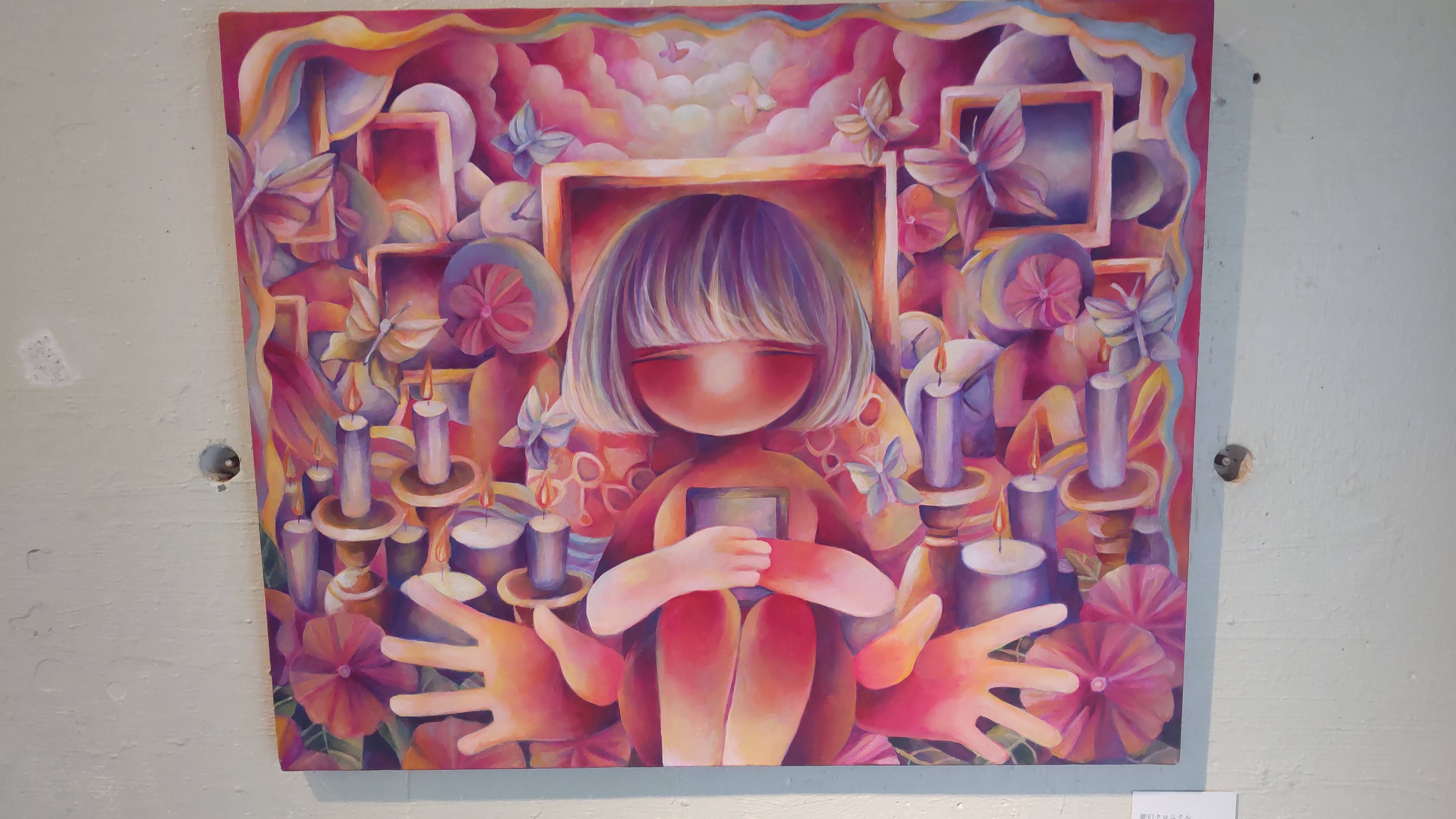 個展で見た時の作品はパーソナルカラー? のピンクマゼンタの鮮やかさが印象に残っていますが、こちらは黄色がかった明るさがいいですね。ぽわんとした光に包み込まれるような印象です。また卒展や個展でも主役級の位置づけだった「かみさまのいないせかい」にも再会することができて……今日は在廊していない(Instagramで29日行きますとコメントしたらお仕事で在廊できないというお返事をいただきました)ですが、なに大丈夫です。しっかり私は感じ取りましたから。