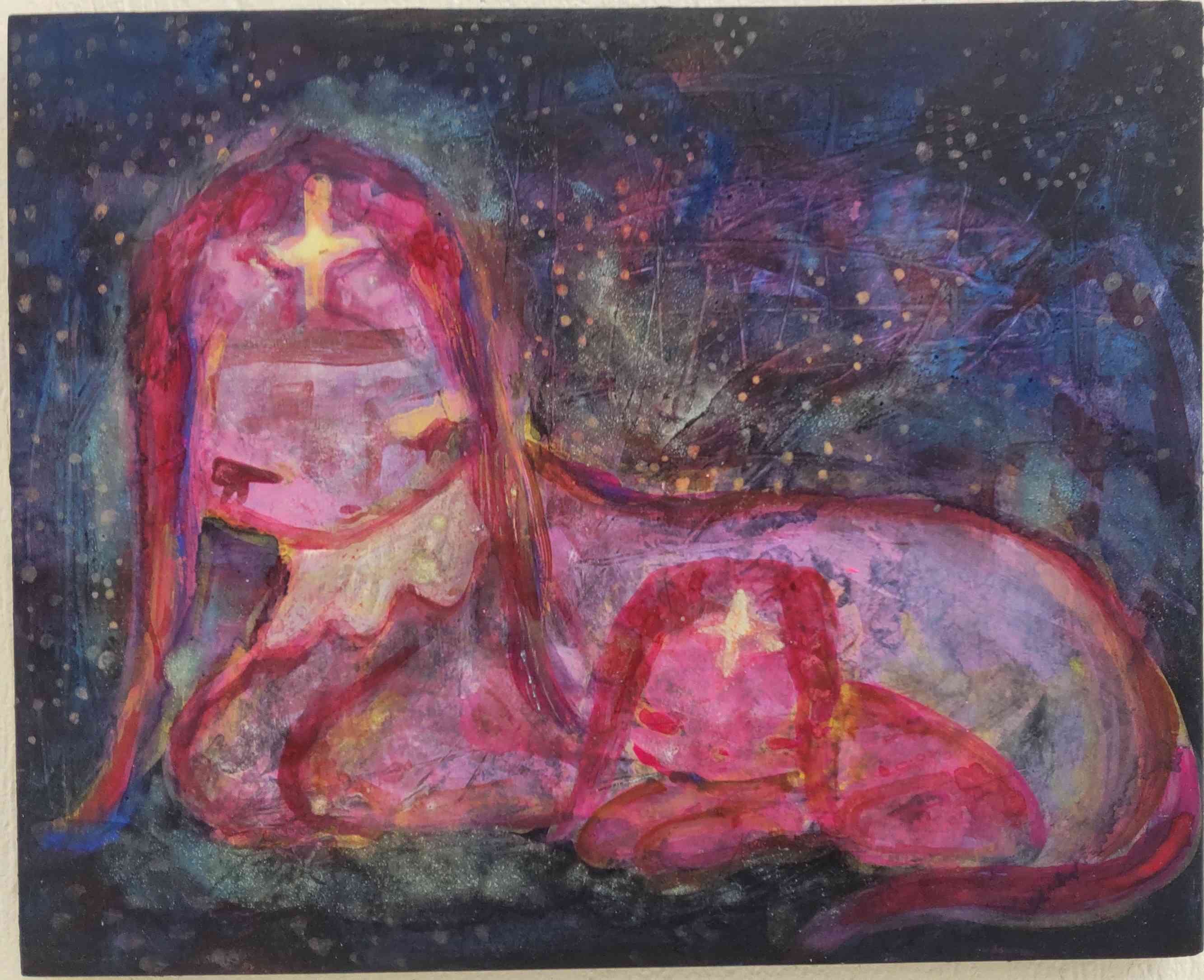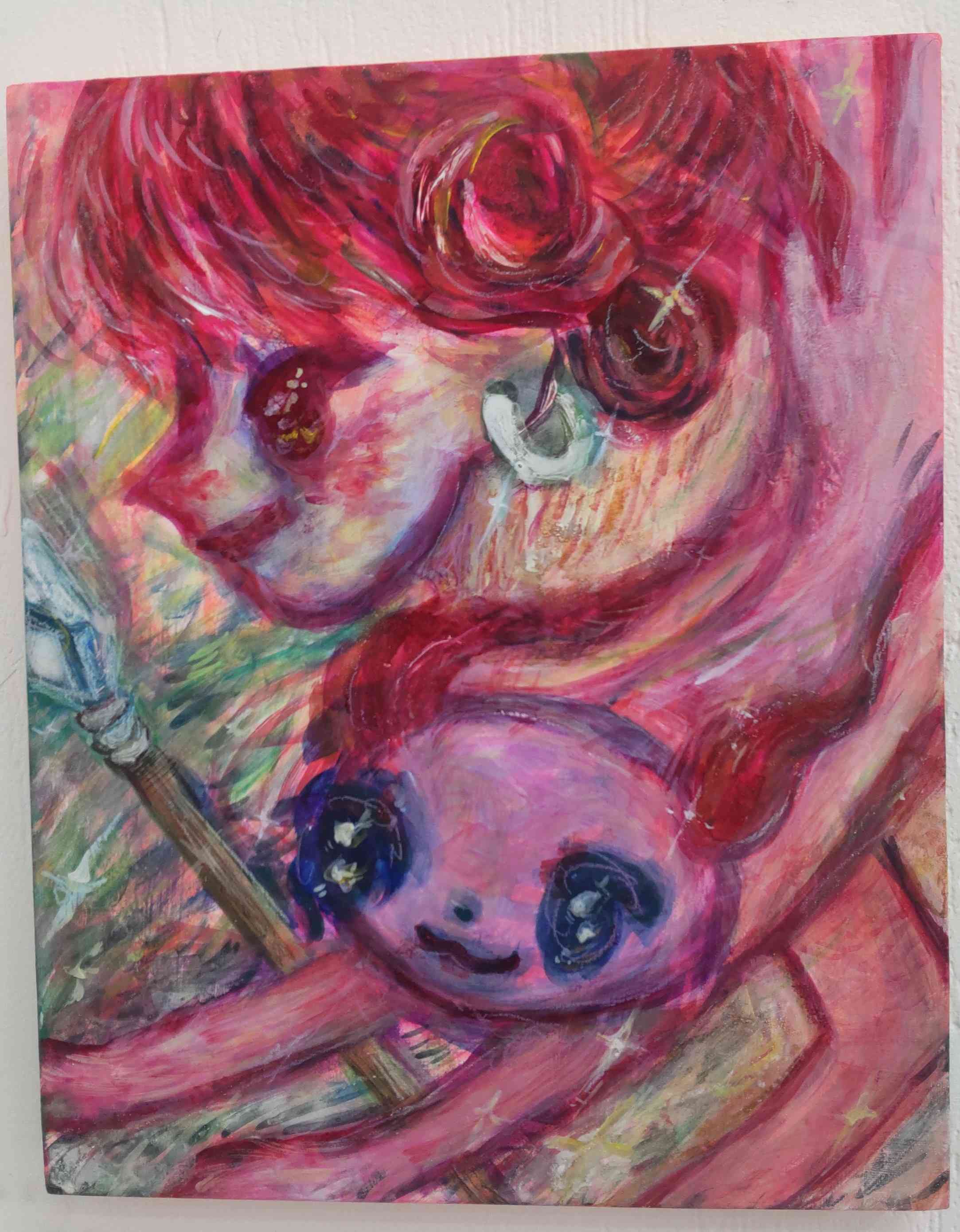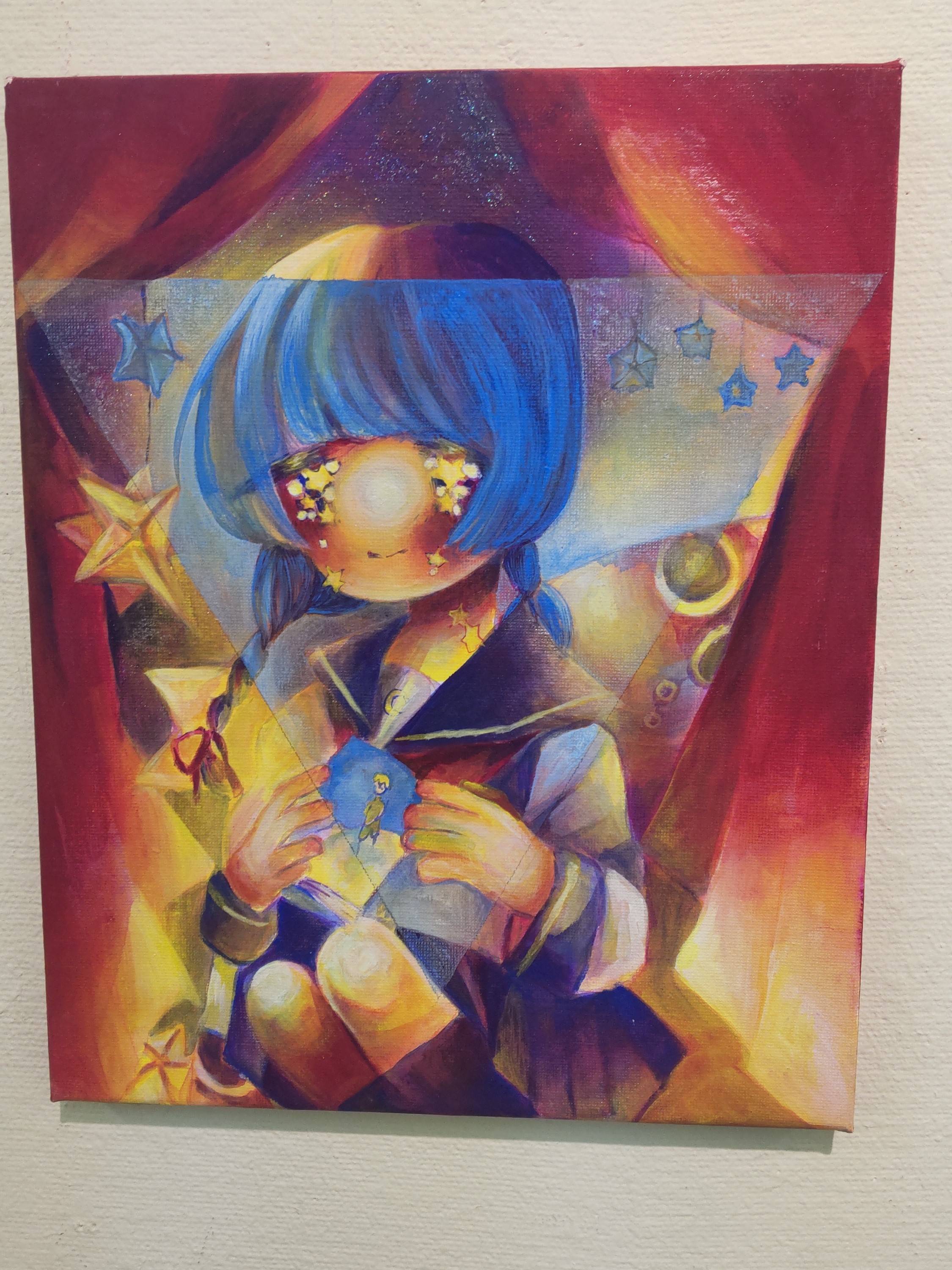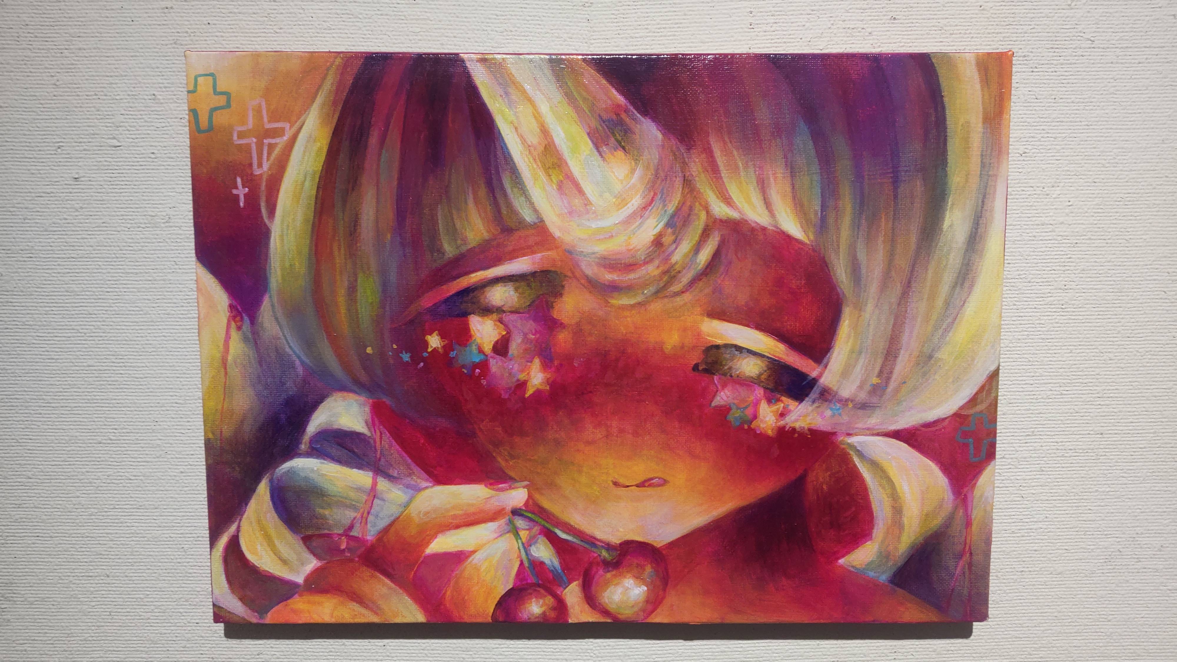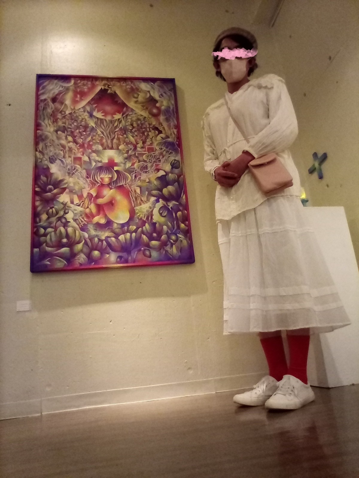 個展で見た時の作品はパーソナルカラー? のピンクマゼンタの鮮やかさが印象に残っていますが、こちらは黄色がかった明るさがいいですね。ぽわんとした光に包み込まれるような印象です。また卒展や個展でも主役級の位置づけだった「かみさまのいないせかい」にも再会することができて……今日は在廊していない(Instagramで29日行きますとコメントしたらお仕事で在廊できないというお返事をいただきました)ですが、なに大丈夫です。しっかり私は感じ取りましたから。