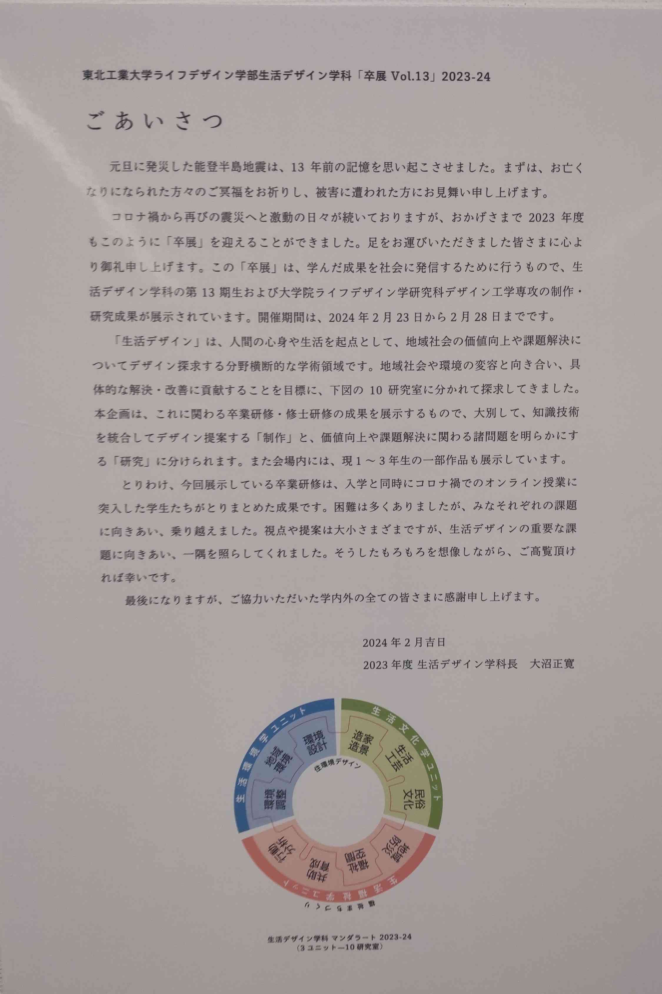 「生活デザイン」は、人間の心身や生活を起点として、地域社会の価値向上や課題解決についてデザイン探求する分野横断的な学術領域です。 地域社会や環境の変容と向き合い、具体的な解決・改善に貢献することを目標に、下図の10 研究室に分かれて探求してきました。 本企画は、これに関わる卒業研修・修士研修の成果を展示するもので、大別して、知識技術を統合してデザイン提案する 「制作」と、 価値向上や課題解決に関わる諸問題を明らかにする「研究」に分けられます。また会場内には、現1~3年生の一部作品も展示しています。
