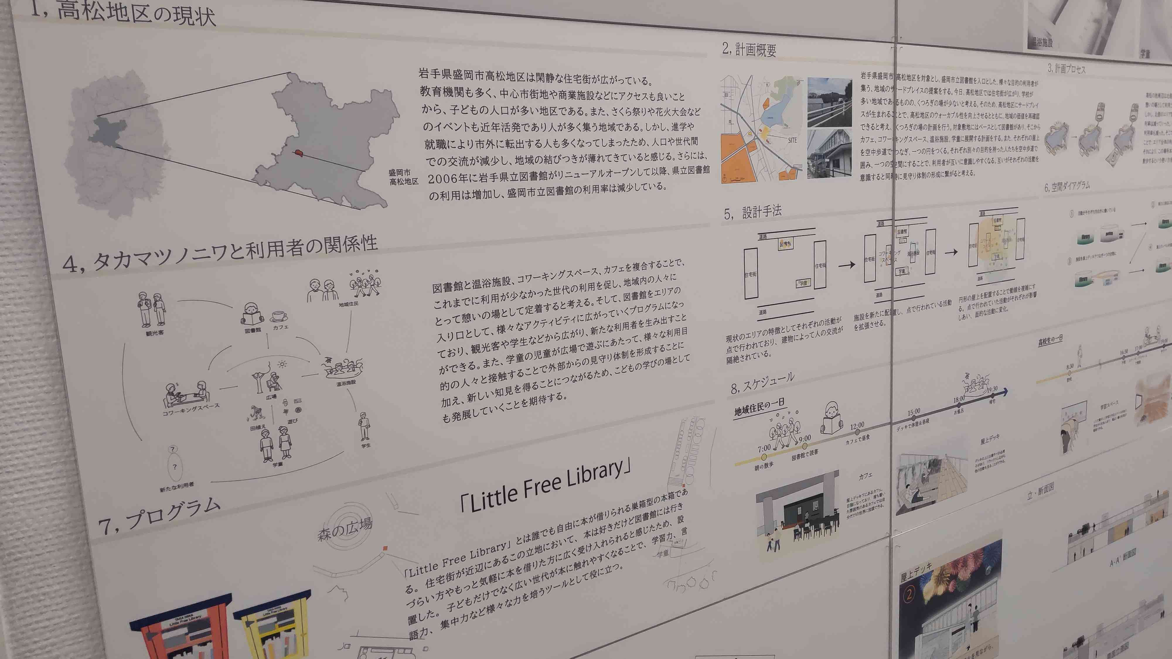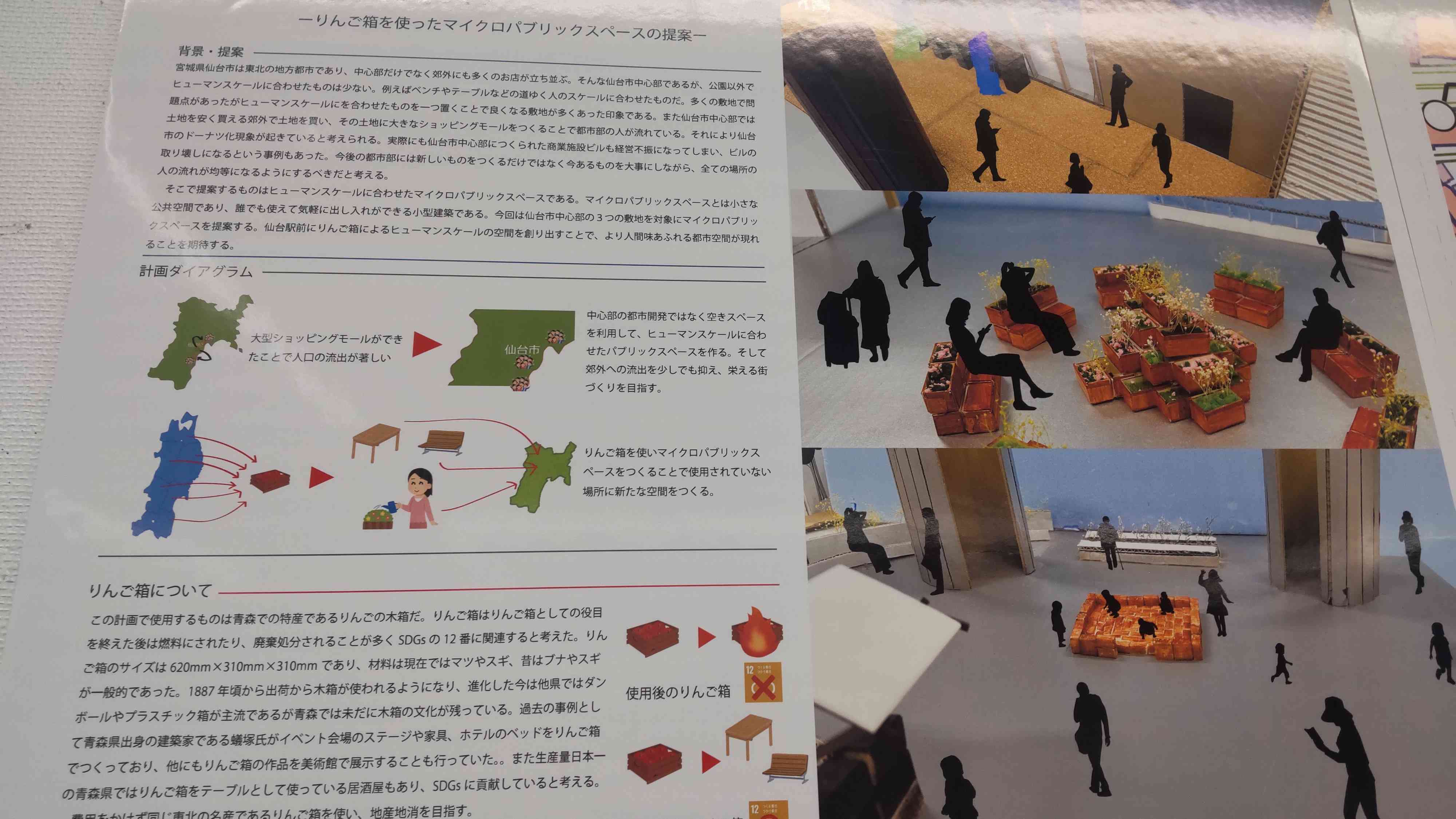 すべての展示を眺めてみて、結構「こういうのが多いのかな」と思ったのは、やはり少子高齢化とか時代の流れとかによって過疎化が進むエリアの再開発に関するアイデアですね。私の大好きなウラロジ仙台さんでも取り上げられ実際にオートバイで行ったこともある丸森町筆甫とか、私の地元である盛岡市の中でも特にお気に入りの場所である盛岡市立図書館のある高松地域とか。中には仙台駅周辺のように「人が留まるスペースがないから結局郊外に人が流れていく=ドーナツ化現象」現状を改善するべくマイクロパブリックスペースを作ろう! という研究もあって……昔、仙台駅前でやった社会実験movemoveを思い出しました。あれで私も体験的に、「街中に人が留まれるスペースがある方が良い」と考えている人類なので、これは大いに共感しました。良いと思います! その気持ちを伝えたいので、写真を掲載していいのかどうかわかりませんが掲載しちゃいます!