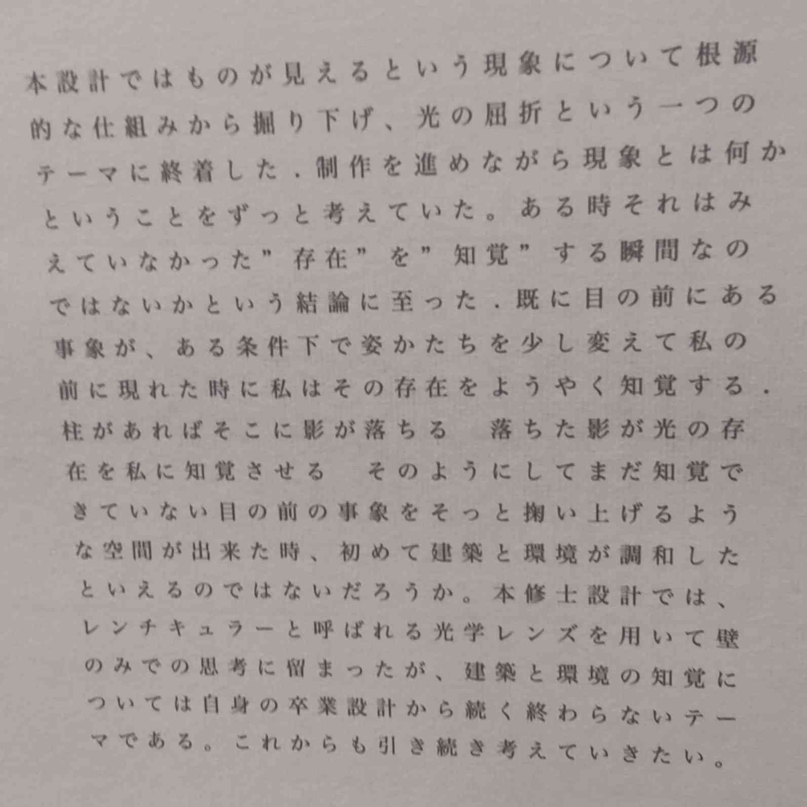 本設計ではものが見えるという現象について根源的な仕組みから掘り下げ、光の屈折という一つの テーマに終着した。制作を進めながら現象とは何かということをずっと考えていた。ある時それはみえていなかった”存在”を” 知覚” する瞬間なのではないかという結論に至った。既に目の前にある事象が、ある条件下で姿かたちを少し変えて私の前に現れた時に私はその存在をようやく知覚する。柱があればそこに影が落ちる 落ちた影が光の存在を私に知覚させる そのようにしてまだ知覚できていない目の前の事象をそっと掬い上げるような空間が出来た時、初めて建築と環境が調和したといえるのではないだろうか。 本修士設計では、レンチキュラーと呼ばれる光学レンズを用いて壁 のみでの思考に留まったが、建築と環境の知覚については自身の卒業設計から続く終わらないテー マである。 これからも引き続き考えていきたい。