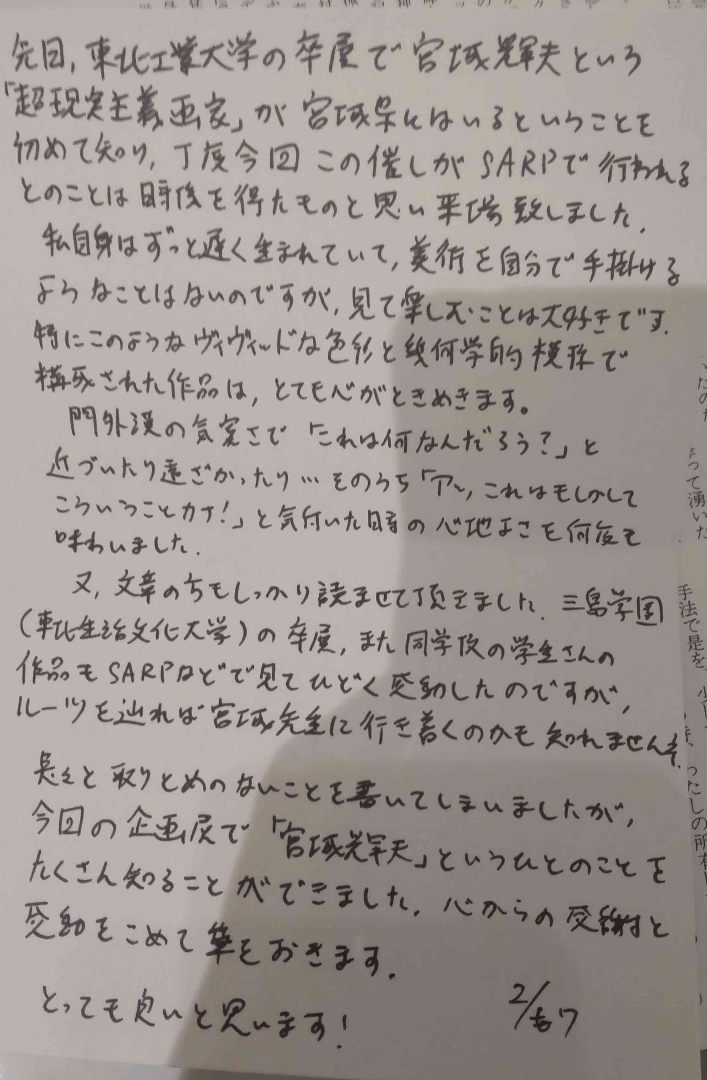 記者さんもまだ仙台宮城に来て間もない若手の方でした。若手の記者が若手の美術家のイベントを取材して、まあそんなに若くはないけど大好きな美術家の絵を見に来た私のことも取材して……心情的にはとても思い入れがあります。このまま忘れられてしまうのは余りにも切ない。だから私は私なりに、そういう出来事があったことを書いておきます。