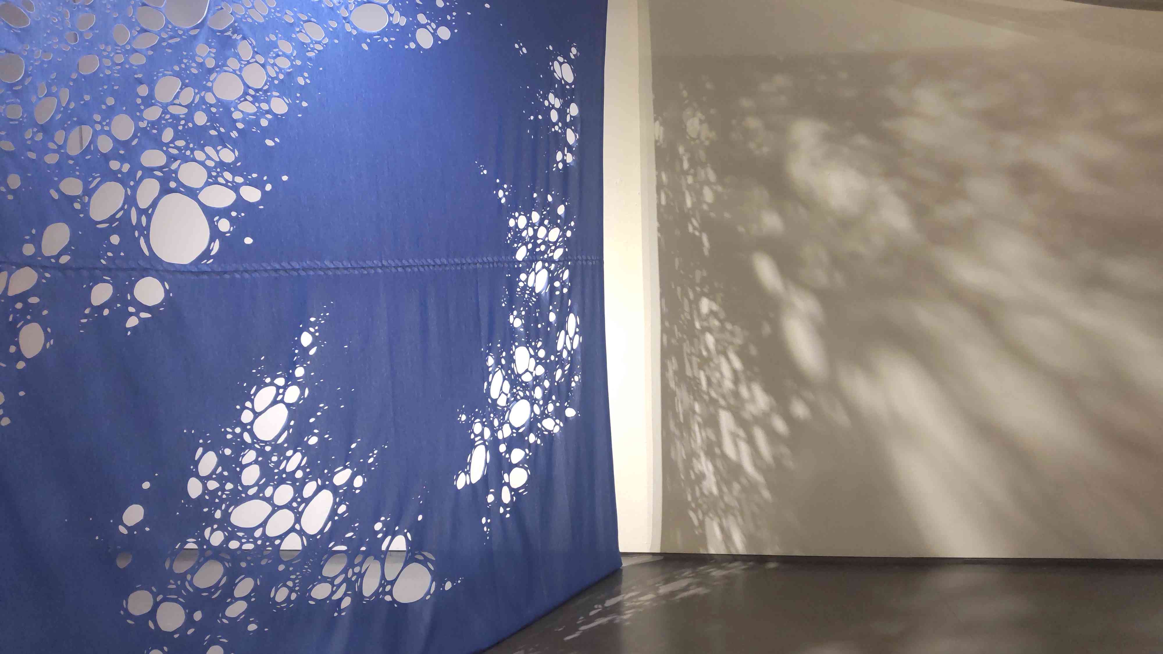 会場では縦方向にひとつながりの連続した絵がぐるりと……つまり壁から天井を這って反対側の壁に降りてきて更に床を這う……という方法で展示されていました。まったく不思議な感じですが、これはタナランの方によれば「スマホの写真をスワイプさせて見る感覚」を表現したものだそうです。