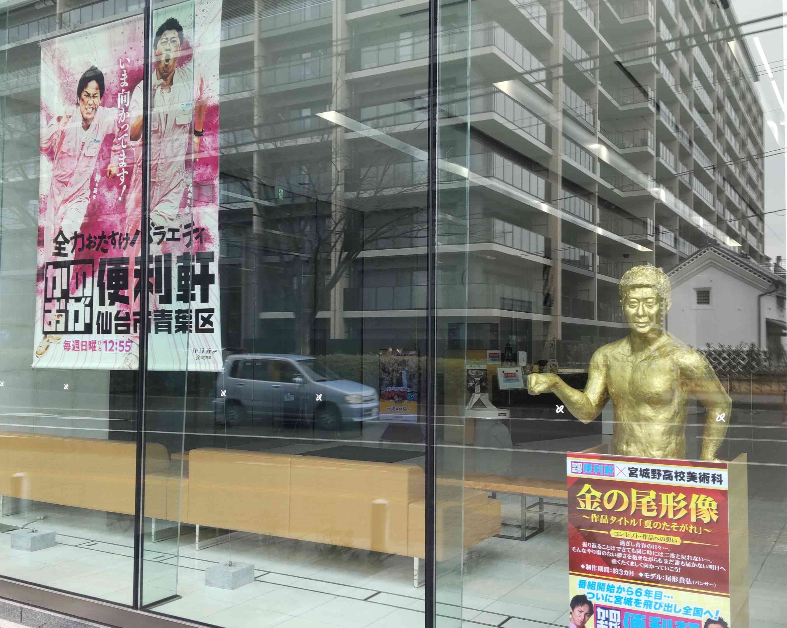 仙台放送というのはフジテレビの直系二次団体(連結子会社)です。そしてこの「かのおが便利軒」というのは私が大好きな番組で、この番組を切っ掛けにパンサー尾形さんのファンになりました(それまではラジオの影響で向井さんが一番好きだった)。毎週録画でリアルタイムで見ているのですが、こないだこの『金の尾形像』が仙台放送本社に飾られていると番組内で放送されたので見に来た次第です。これは私のアート趣味というよりは尾形さん好きが先行してるかな。ええ、もうね。こないだのイベントでは、尾形さんのサインと握手をもらいたくてフォーラスのTシャツ買ったくらいですから。今はそのくらい好きなんです。