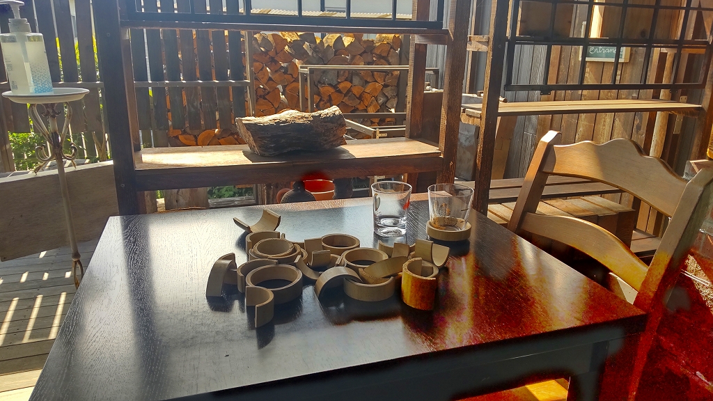 お店の雰囲気も、おそらくご主人が自ら切り出して来たであろう木の椅子など、自然感爆発で心地よいです。ちょうど私がお伺いした時はご主人がテラスでこのように手作りのコースターを作っているところでした。