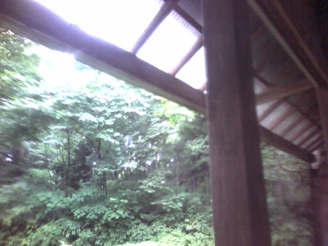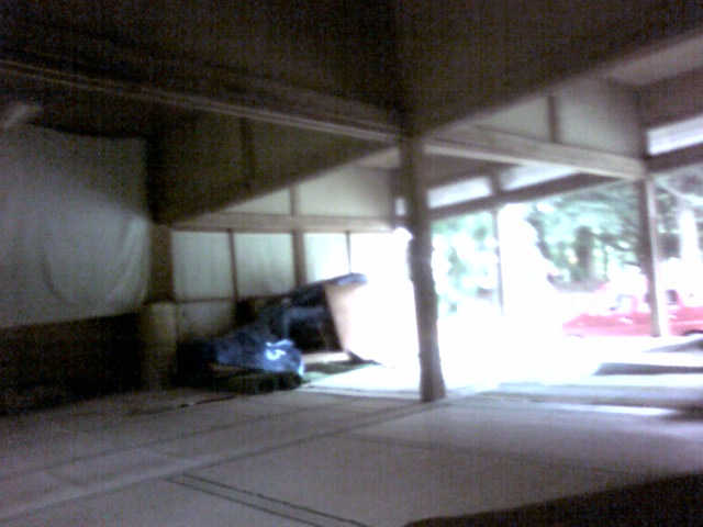 昨日行ってみたら、社務所? の戸板がすべて外され、ものすごく通気性がよくなっていました。当然、誰もいません。ただ、なぜか「いいちこ」の空き瓶がぶっ転がっていたりしたので、きっと誰かが盛大に飲み会とかをしたのでしょう。
