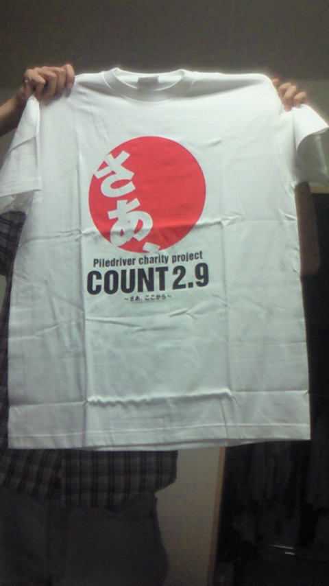 これは、鈴木みのる選手が提唱し、それに賛同する選手たちで開催したチャリティー興行『カウント2.9』の記念Tシャツ。会場に駆けつけることは出来ませんでしたが、ネットショップで購入しました。VMのチャリティーTシャツはちょっと着て歩くことが出来なくなってしまったので、こっちはちゃんと着て歩きたいと思います。
