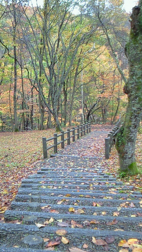 着いたのが平日の午後3時過ぎ、しかも天候は雨模様とくれば、来るのは私のような特殊な人間だけ。ややもすると(色々な意味で)肌寒さを感じつつ、紅葉を満喫するため遊歩道へゴー。