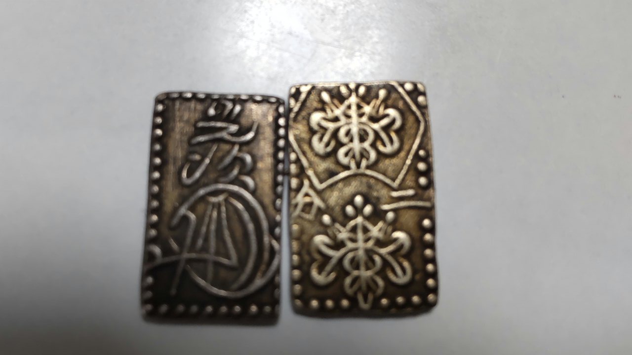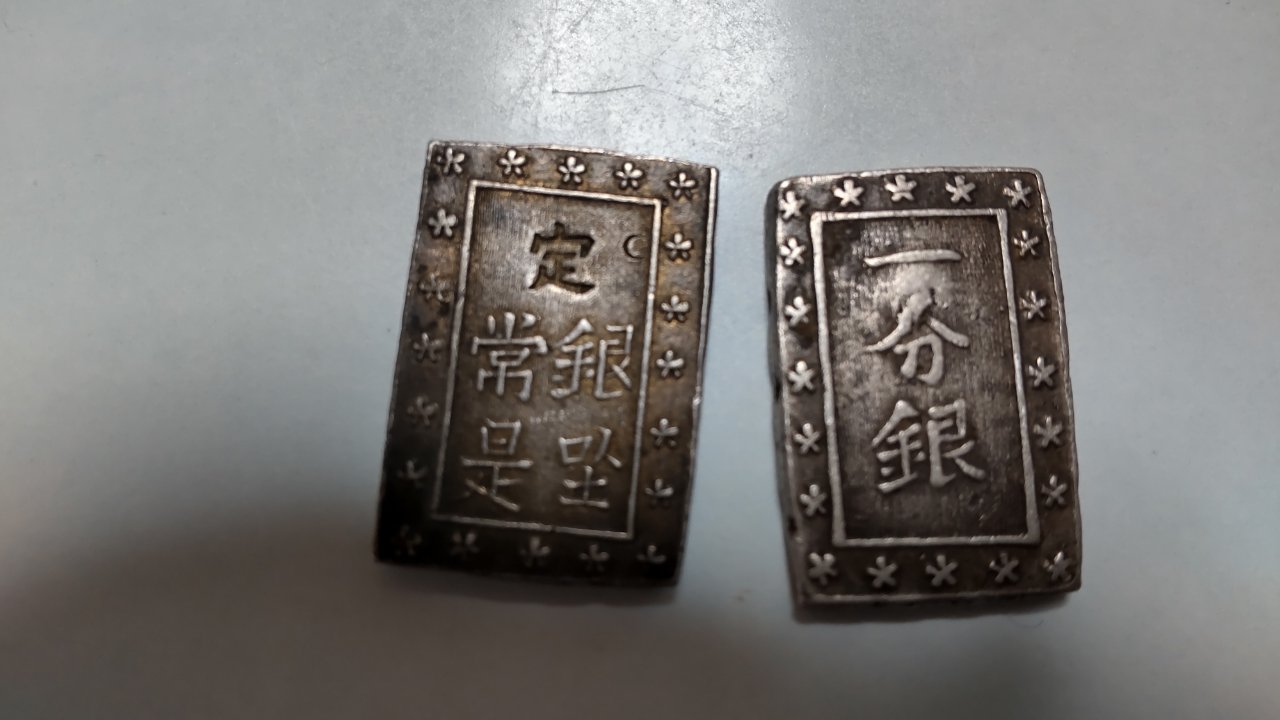 通貨の最小単位たる「文」は、250枚で「一朱銀」にランクアップします。この一朱銀を4枚集めると、この「一分銀」になり……