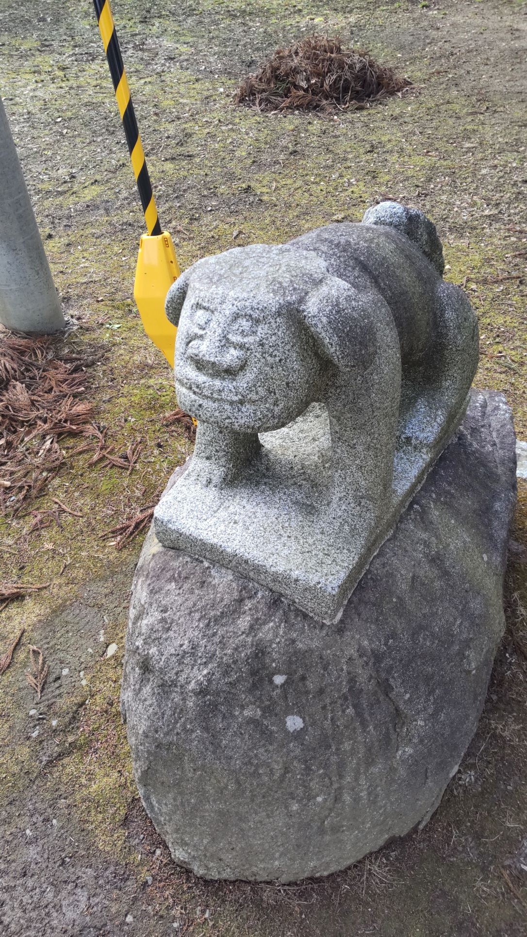 まあパッと見てわかると思いますが、どうも妙ちくりんな造形をしています。皆様も狛犬といえば、大体にいかめしい顔をしたものを想像されると思いますが、これはどうも……ね。