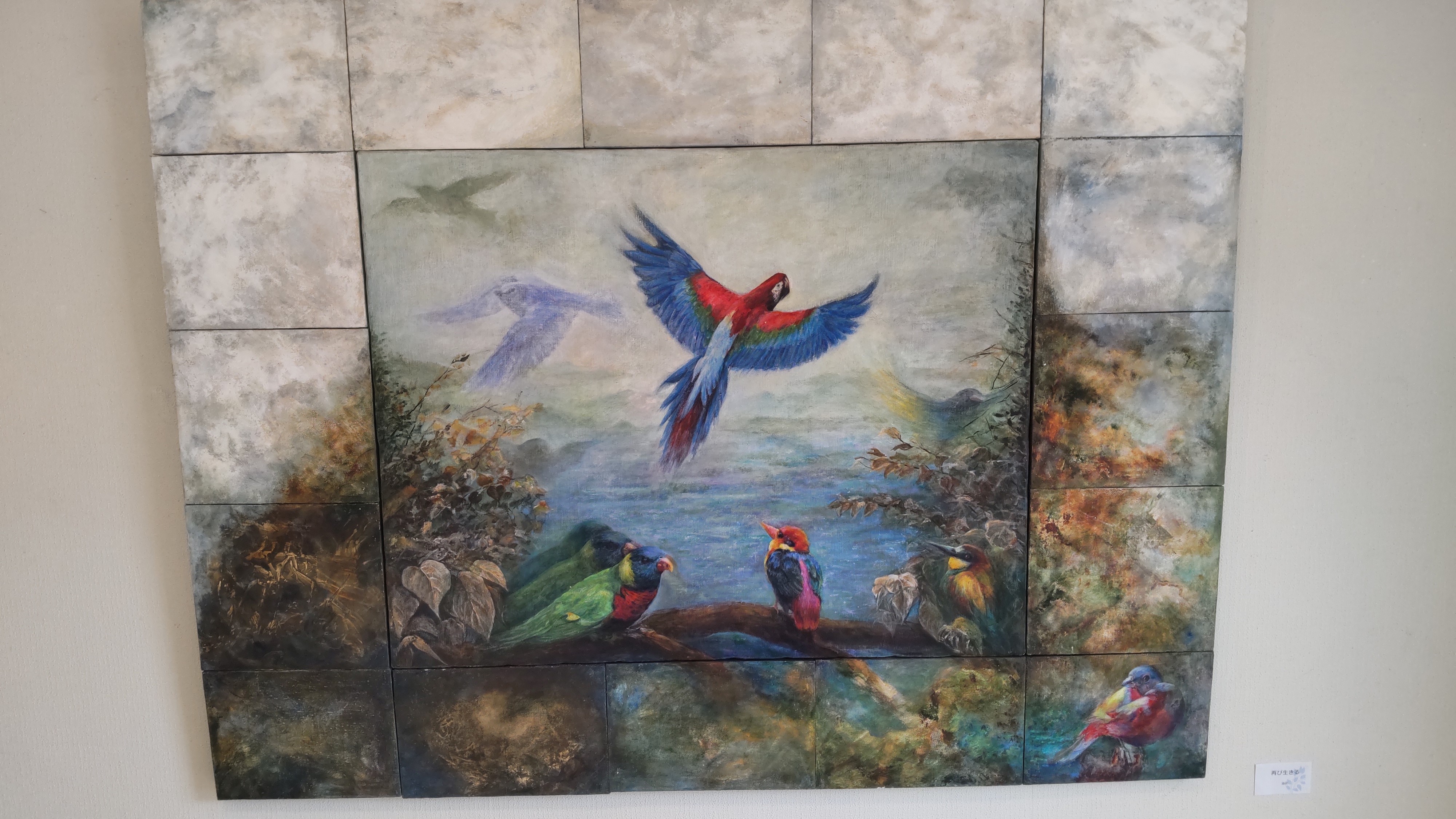 そして感情家の私はどう思ったのか。じっと見ていると、特に真ん中の鳥ですね。これが、もう……キャンバスから浮き出して見えたんです。そのくらい印象が強くて。いや本当にステレオグラムとか、ああいう仕掛け絵を見た時のように、この鳥が飛び出してきたような錯覚をしました。隣の部屋でインスタレーション作品の準備をしているから、というのもあったのですが、いつまでも見飽きない、素敵な絵でした。いぎなり良いと思います!