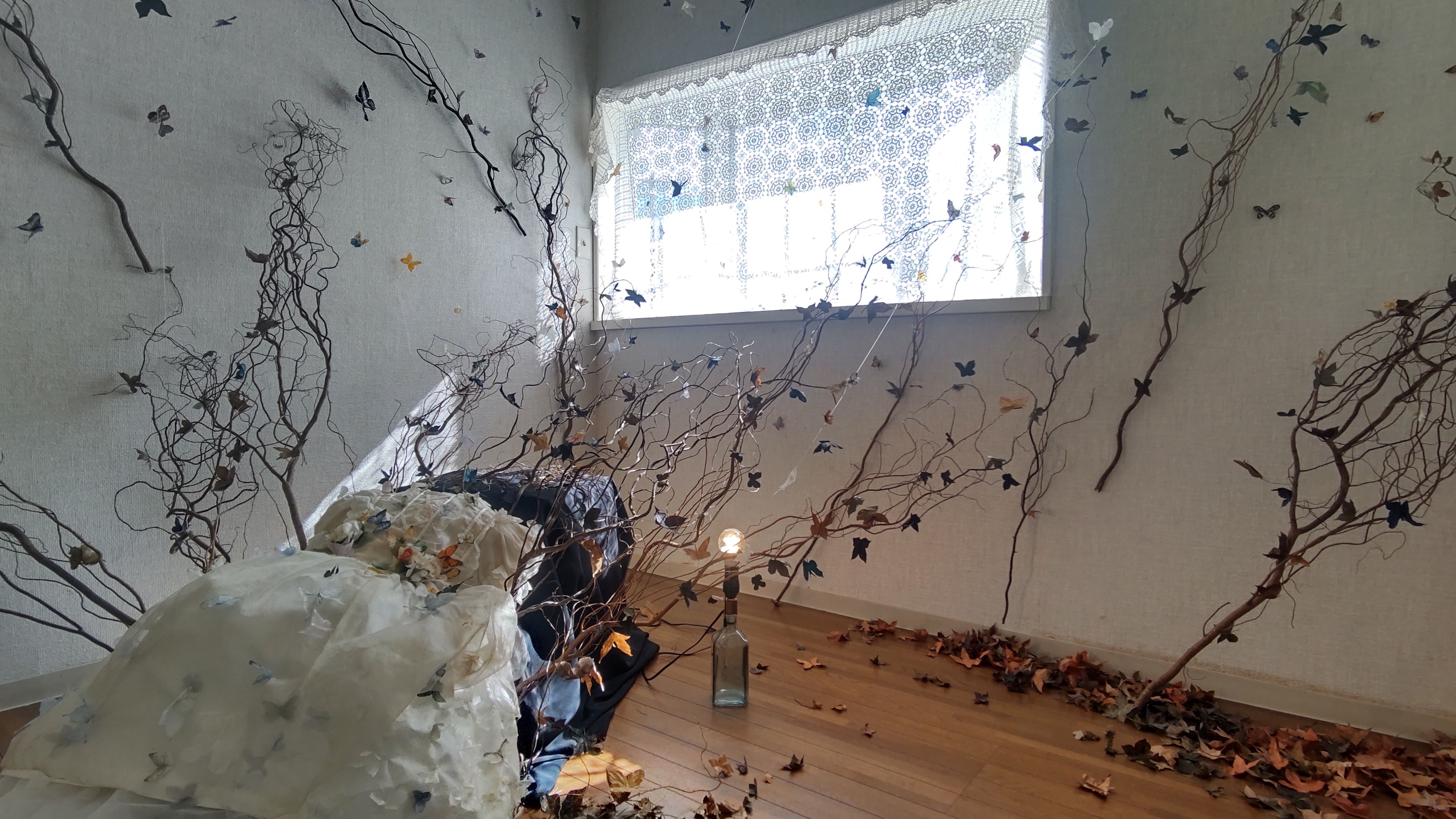 30年前に少女を飾ったドレスは役目を終え、少しずつ朽ち始めていた。しかし、Rimoさんの手によって新たな生命を吹き込まれたドレスからは清らかな水が流れ出し、それを含んだ木々が成長して部屋いっぱいに広がっている。やがて無数の蝶が宿り、ここは思い出と希望をたたえた『万葉の森』となったのだった……。