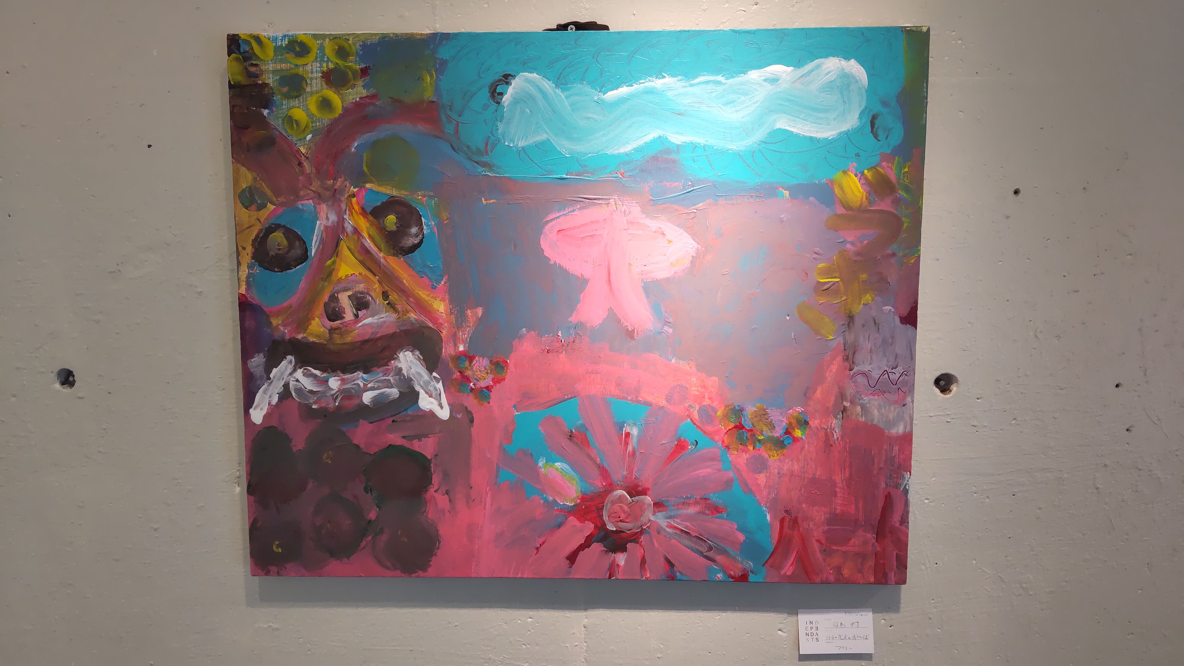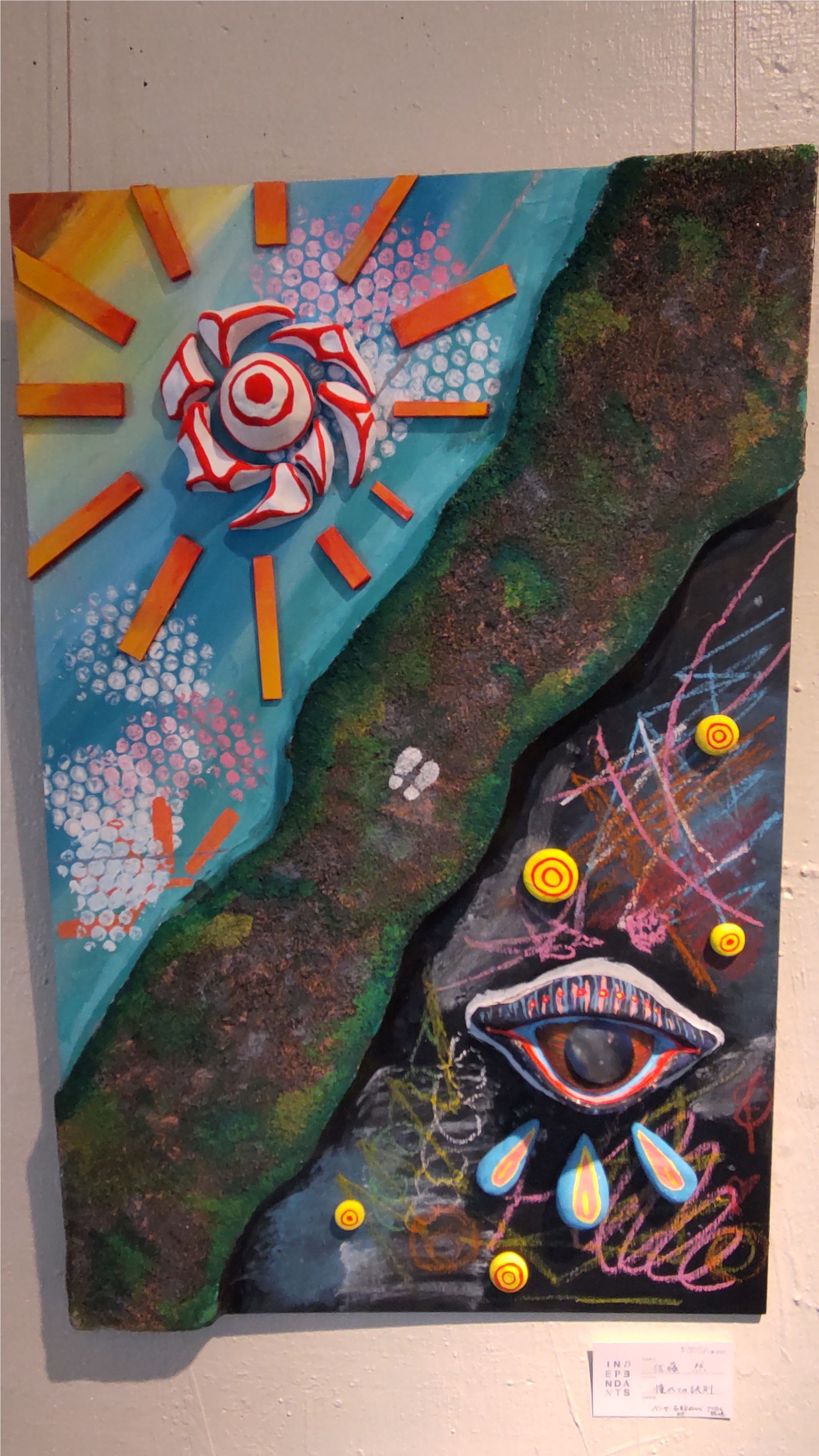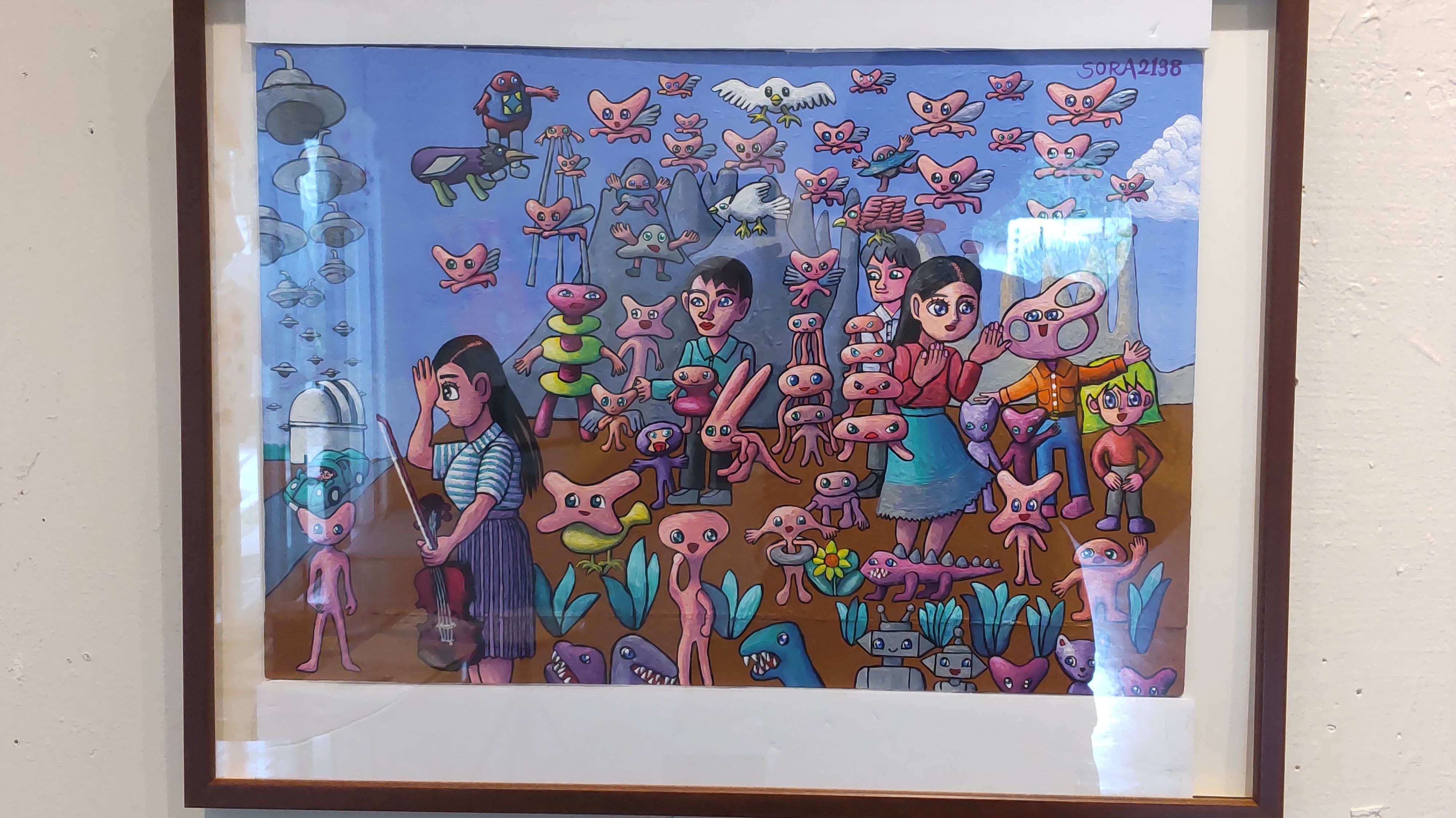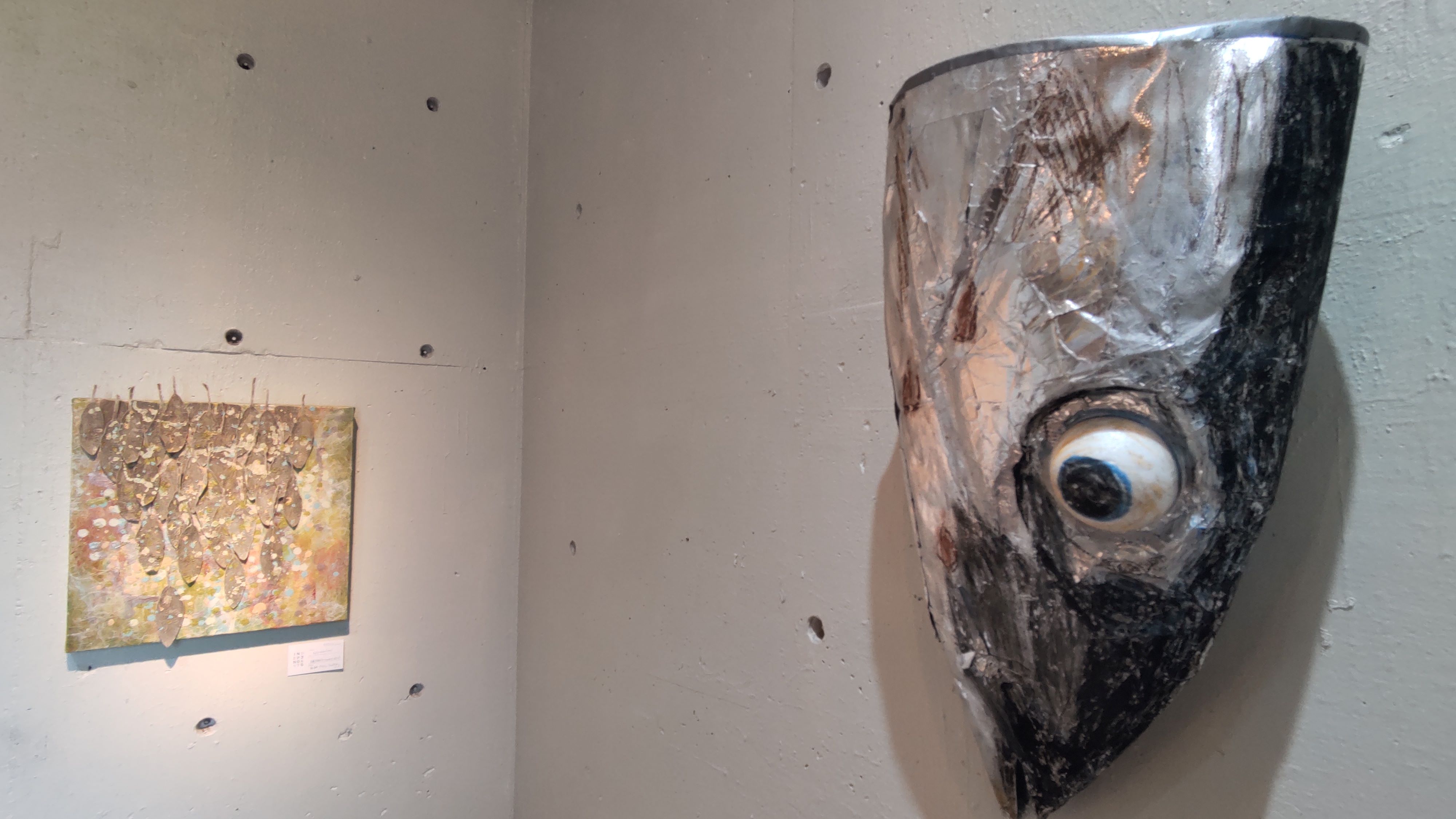 ここもなかなかバラエティに富んでいました。幼稚園だったか保育園だったか……子どもたちが真っ白なTシャツに思い思いの絵の具で彩ったシャツの歓迎を受けて館内に入ると、こちらも平面と立体それぞれの作品が展示されていました。まずは、ざっと写真をあげてみます。