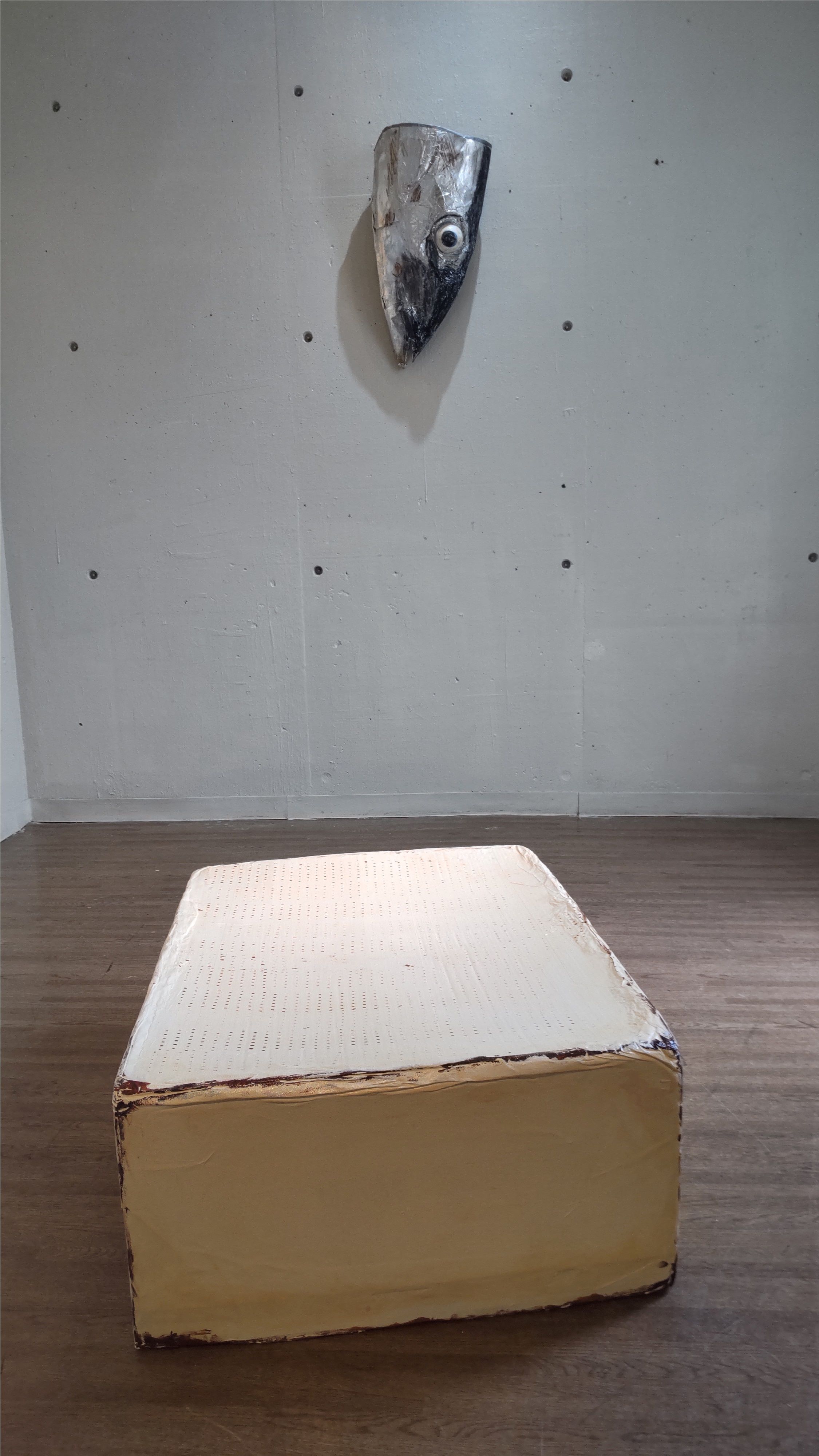 あと、4枚目のさんまのあたまについては、作者の意図とは違った写真の撮り方をしています。本来はこのような形で1セットとなります。手前の段ボール箱は豆腐であり、「醤油をかけたくなるもの」というのがコンセプトだそうです(後で展示リストと製作者のコメントを読んで気づきました)。ただ、私がパッと見た時の印象を伝えるため、あえてあのような構図の写真を先に掲載しました。