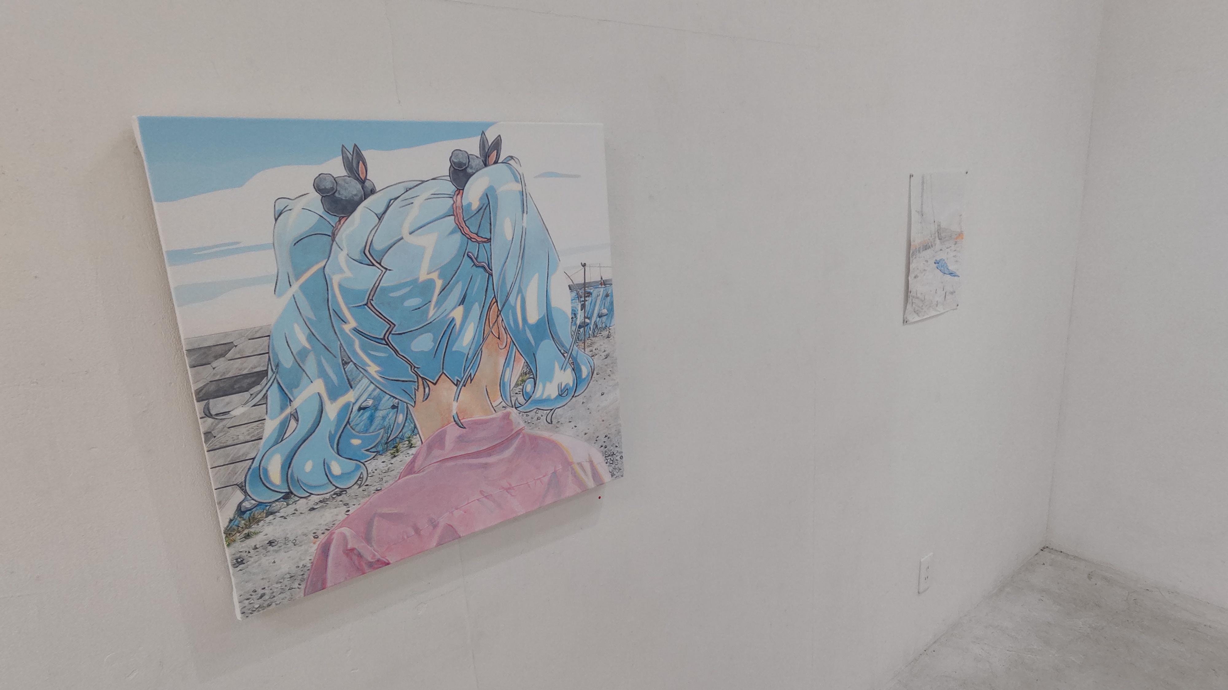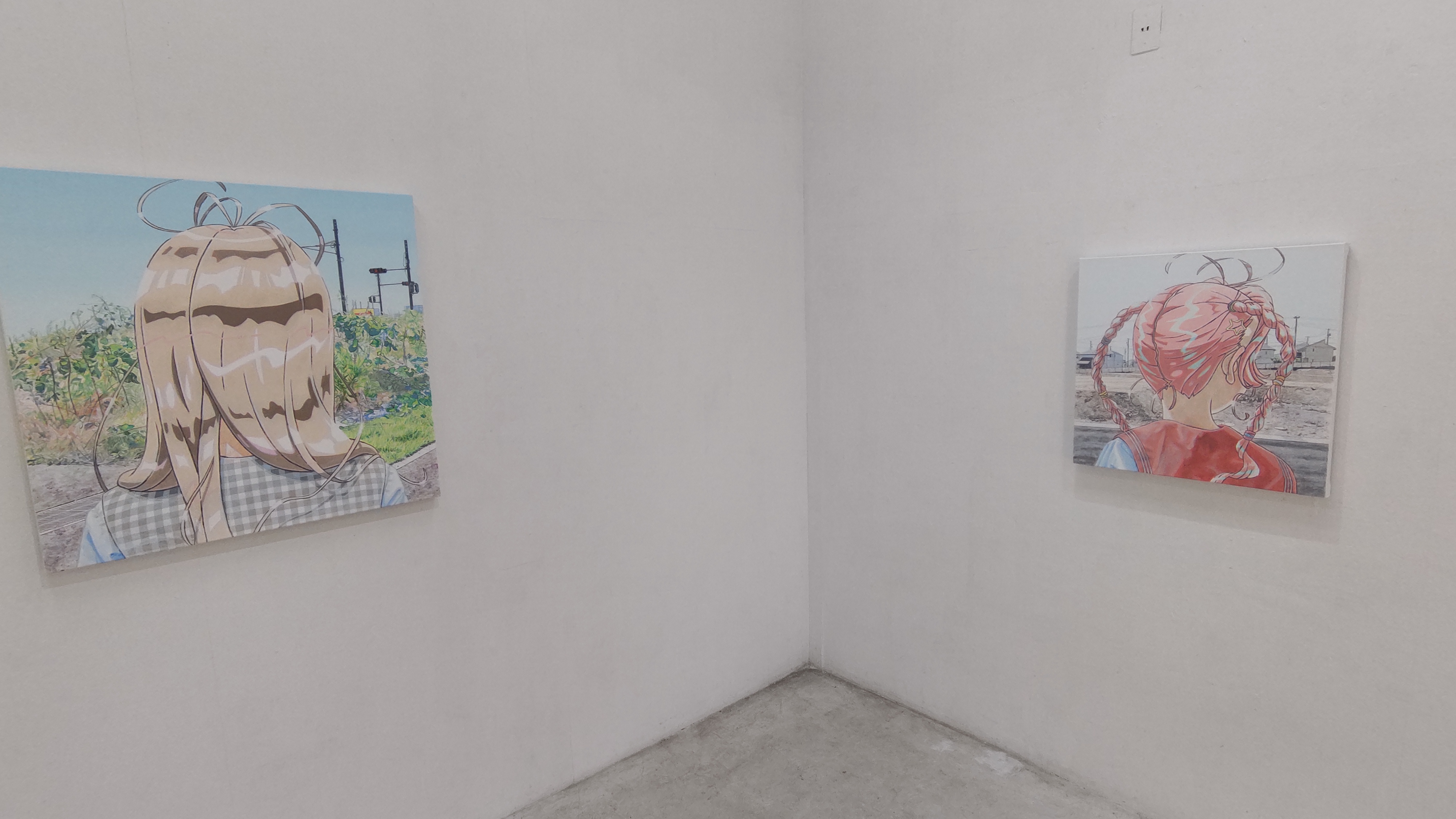 河北新報の記事でこのようにおっしゃっていた門眞さんの意図を念頭に置きながら見ました。正面を向いた女の子の絵もあり、それはとても可愛らしい絵柄で、割とわかりやすく心を打ったのですが、それでも強く印象に残ったのは後ろ向きの女の子たちでした。それはあまり見慣れない構図だったからだとは思います。例によってここでその意図とか効果とかを説明する知識がない私のきわめて感情的な――しかもそれは、ほぼ1年前に見た記憶とその時に撮影した写真をいま見直しての印象が入り混じった、非常に不確かで頼りない――印象となってしまいますが、ともかく言葉にして言います。