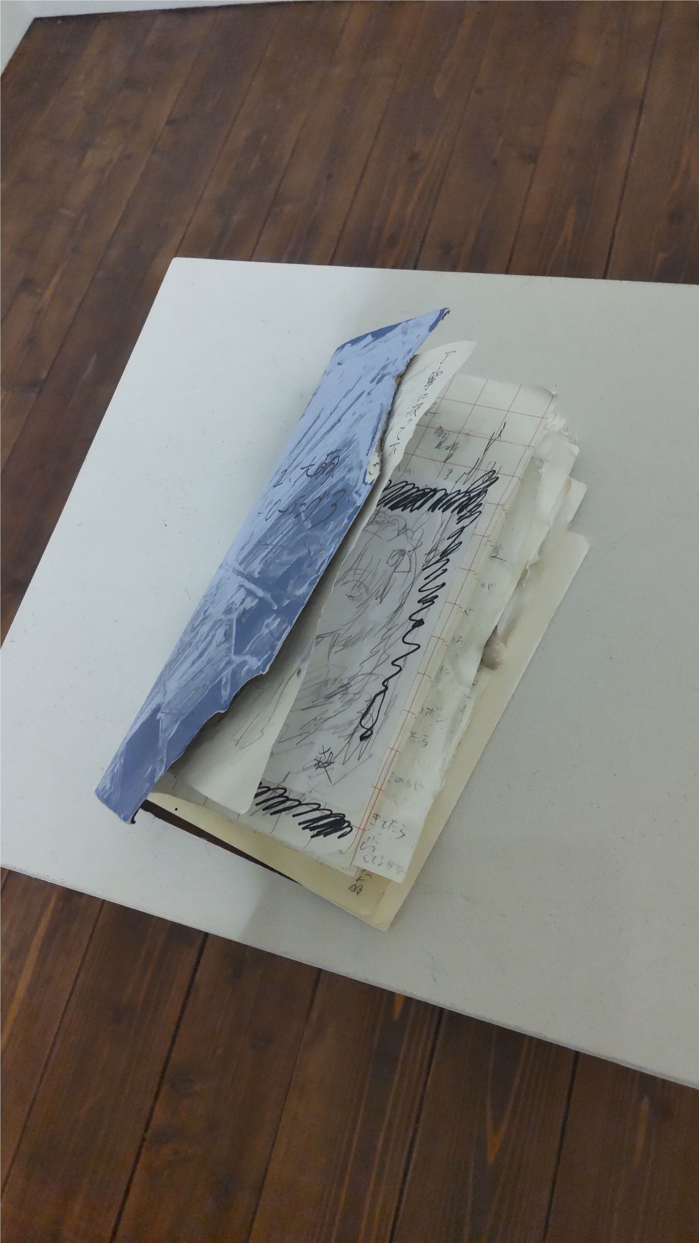 これは一緒に会場にあった『ユ、六萠』さんの創作ノート(というのかな?)です。そっと中身を見させていただきましたが、その時に、私といま自分が見ている美術の世界をさえぎっていた透明な壁がパリンッ! と音を立てて崩れ落ち――見ている私もようやく門眞さんとペロンミさんとユ、六萠さんの世界に入り込めたような気がします。