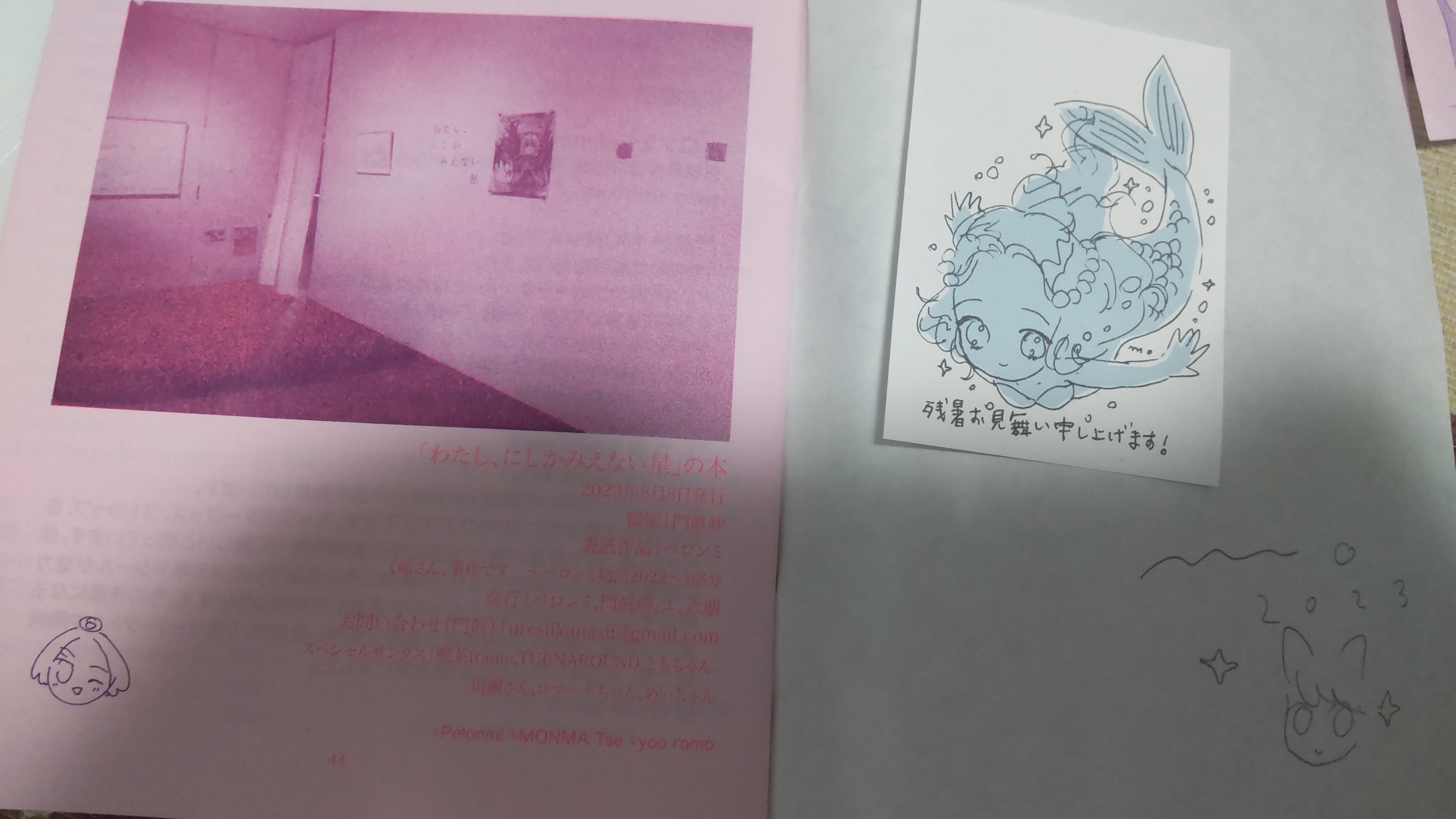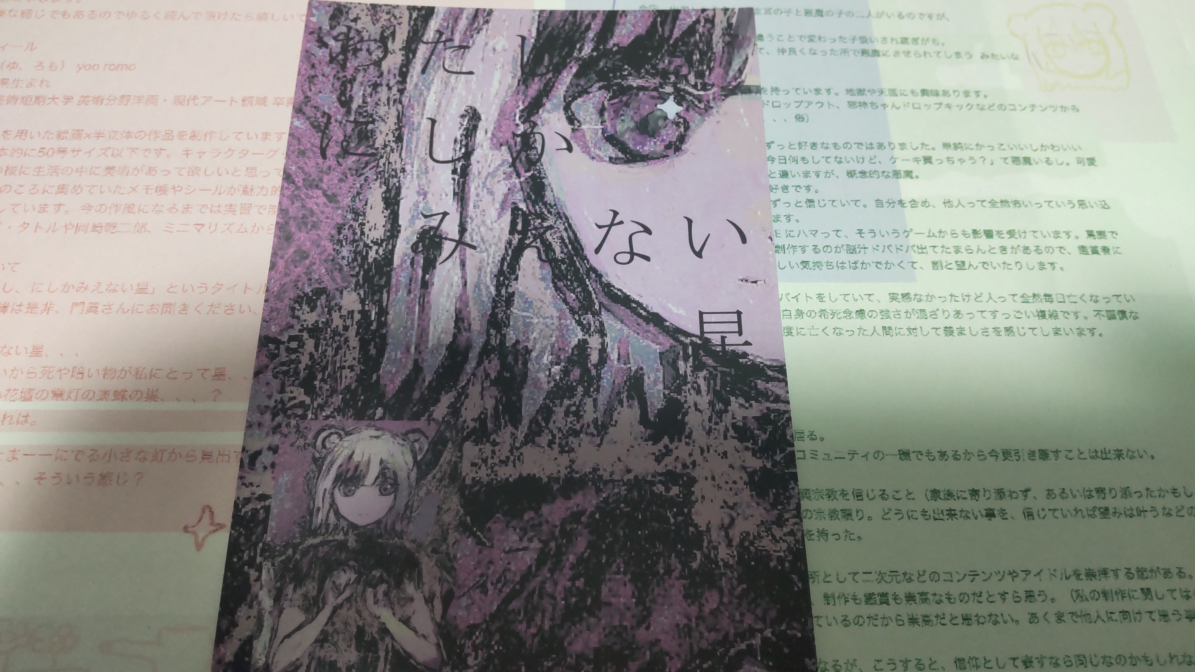 これはお知らせのはがきと、会場にあった『ユ、六萠』さんのテキストです。活字を食べて生きてきた人間なので、こういうのはしっかり読みます。門眞さんの、開催にあたってのテキストもじっくり読みました。ペロンミさんは……いいんですよ。逆にSNSで何のコメントもなくパン! と画像を見せられて、ウムム!? とうなるのがいいんです。ペロンミさんは問答無用なんです。なんかすごいこと言っちゃった。いや本当に皆さんの作品がとっても好きです。