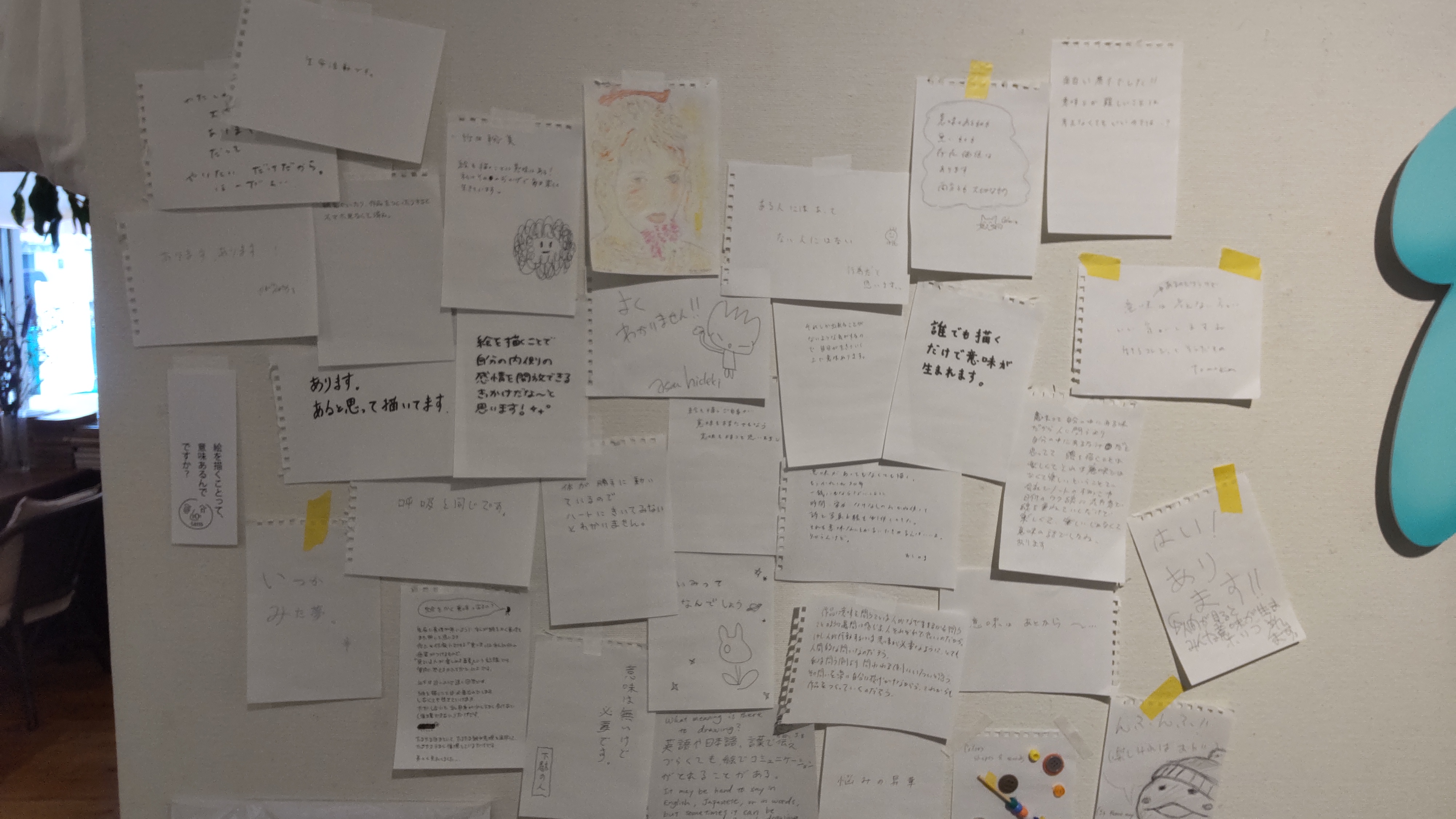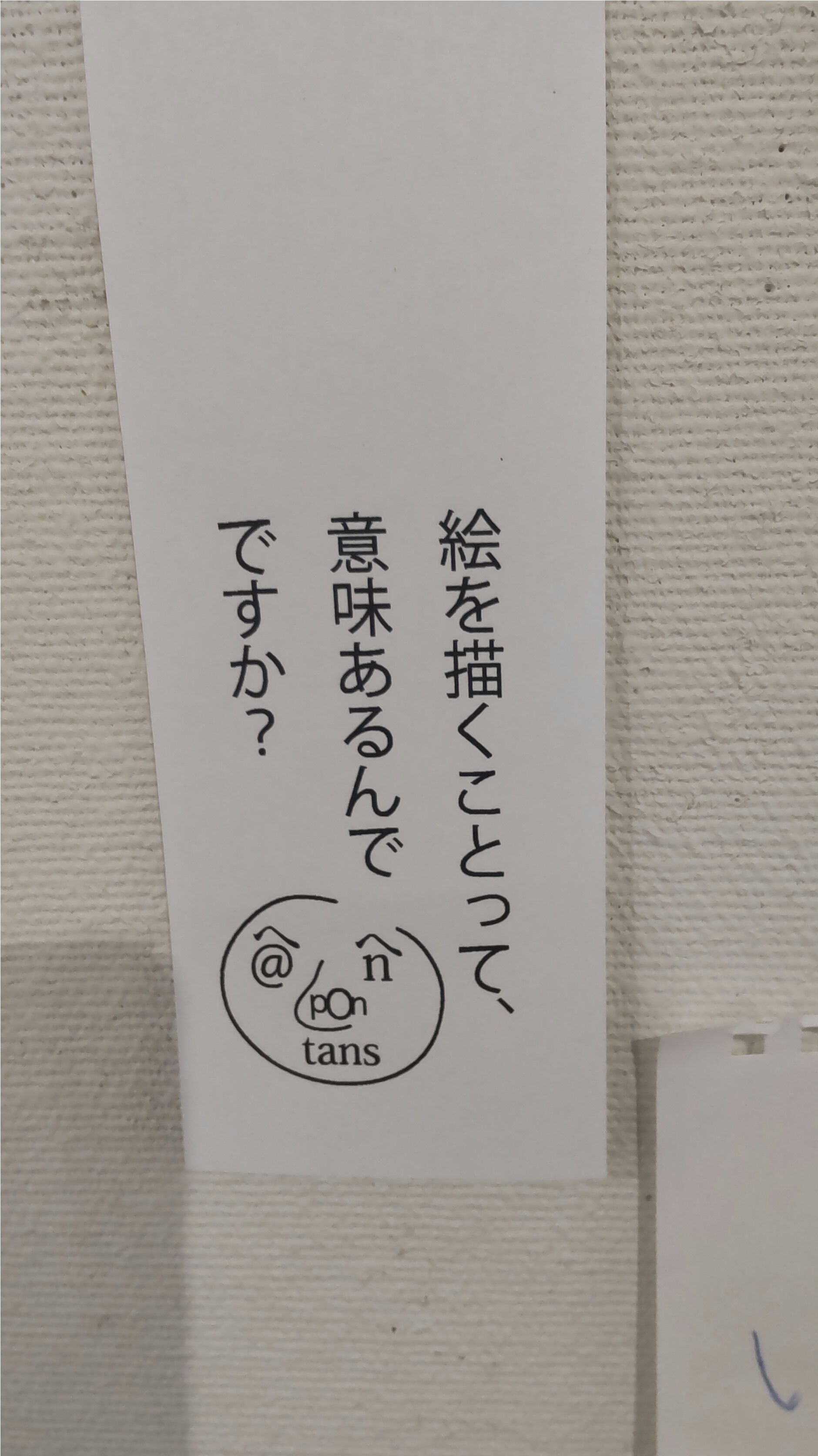 今の時代にあっては、本当に恐ろしい問いかけです。でも、それに対して皆さんそれぞれあるとかないとか分りませんとか、自分の言葉でまっすぐに答えていらっしゃいました。そもそも絵を日常的に描いていない私まで何とか答えを引き出して書いて貼り付けてきました。その時にちょうどギャラリーの方とお話しする機会があったので、このアンポンタンズって何なんですか? ということを聞いてみました。