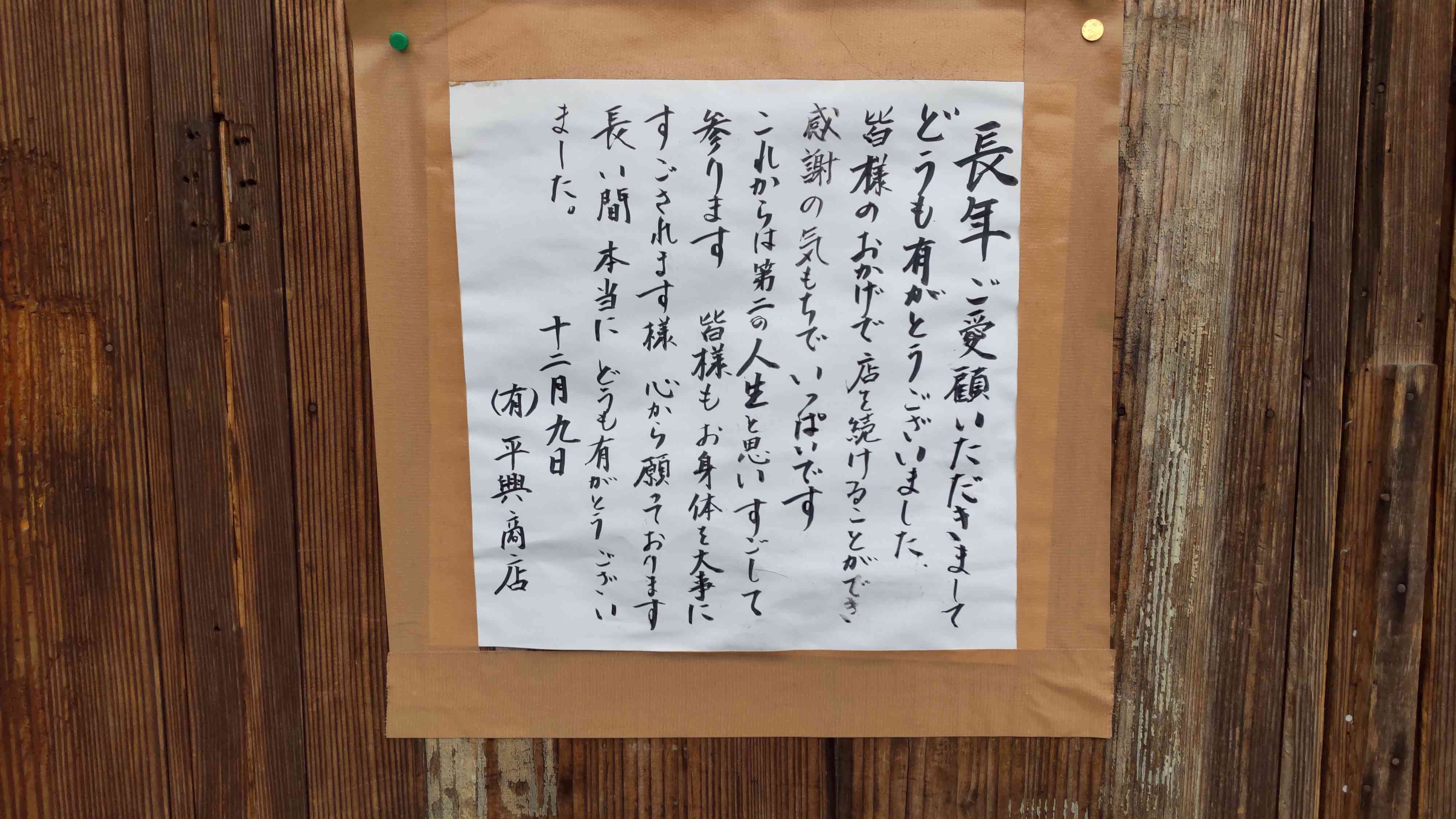 先ほどの鉈屋町から少し歩いたところ、もう少し街の中心に近い下町である紺屋町の「平興商店」です。こちらは昨年12月に閉店したそうです(参照記事)。