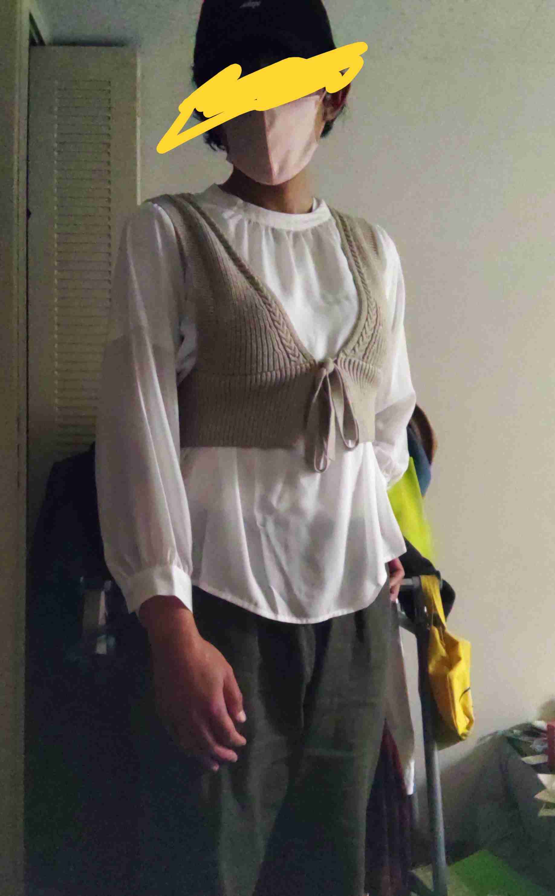 今日は久々にパンツルックでお出かけました。正直暑いのか寒いのかよくわからなかったので薄手のバックボタンブラウスと、使い道が今一つよくわからなかった「ビスチェ」というのを着用……これに例のダウンジャケットを合わせてみました。出先で写真を撮影するのを忘れたので、家に帰ってきてから撮影しました。