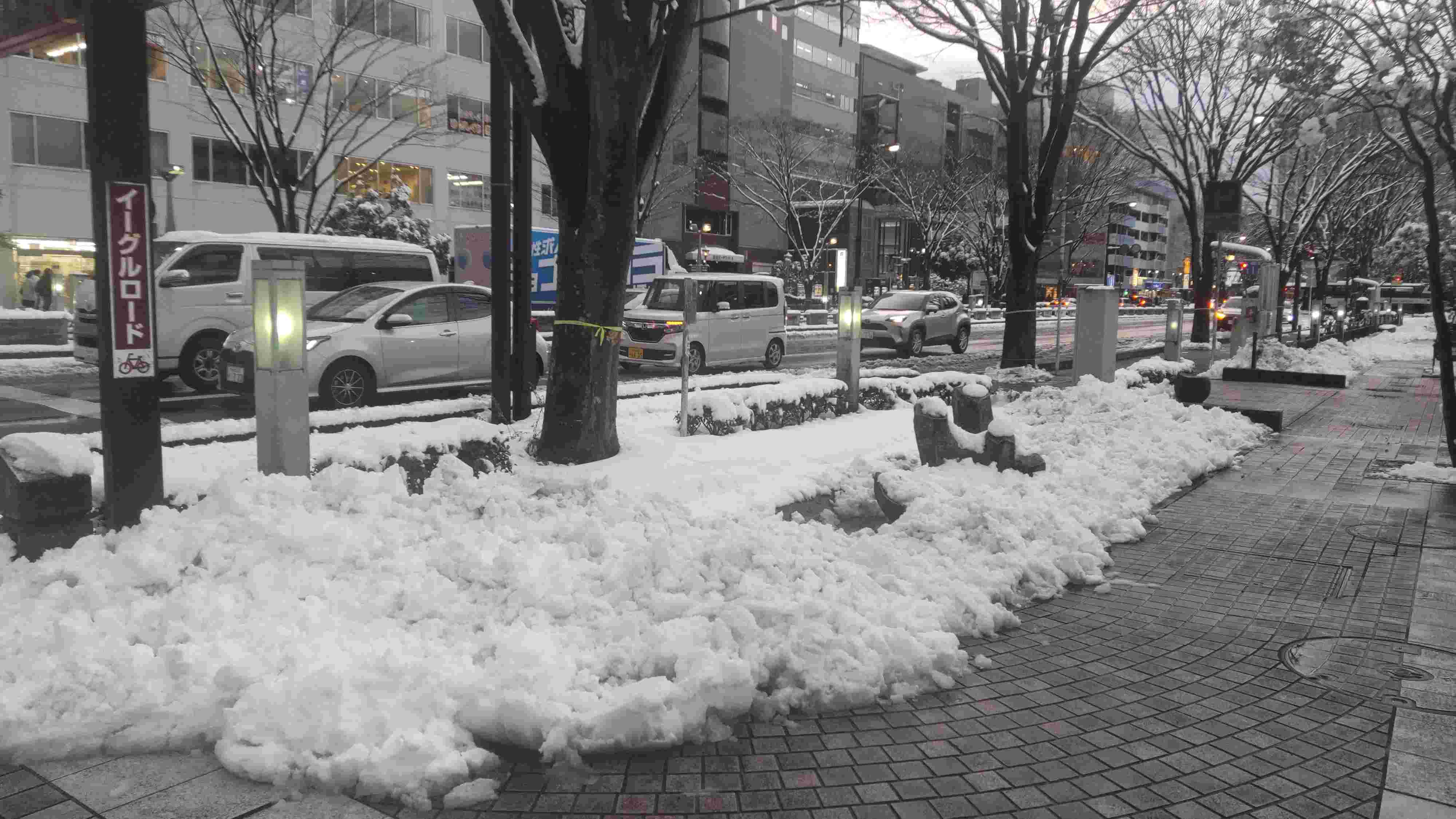 こちらは私の退勤時(17時ころ)の宮城野通の模様です。地域住民の皆様の尽力により全力除雪が行われた場所はちゃんと歩きやすい状態だったのですが、そうでもない大部分は溶け残った雪がベチャベチャして非常に歩きづらかったです。特に靴底がフラットな革靴だったので一歩踏み出すごとに「ズルッ」「ズルッ」となっちゃって……まあ転倒しなかっただけマシかな。