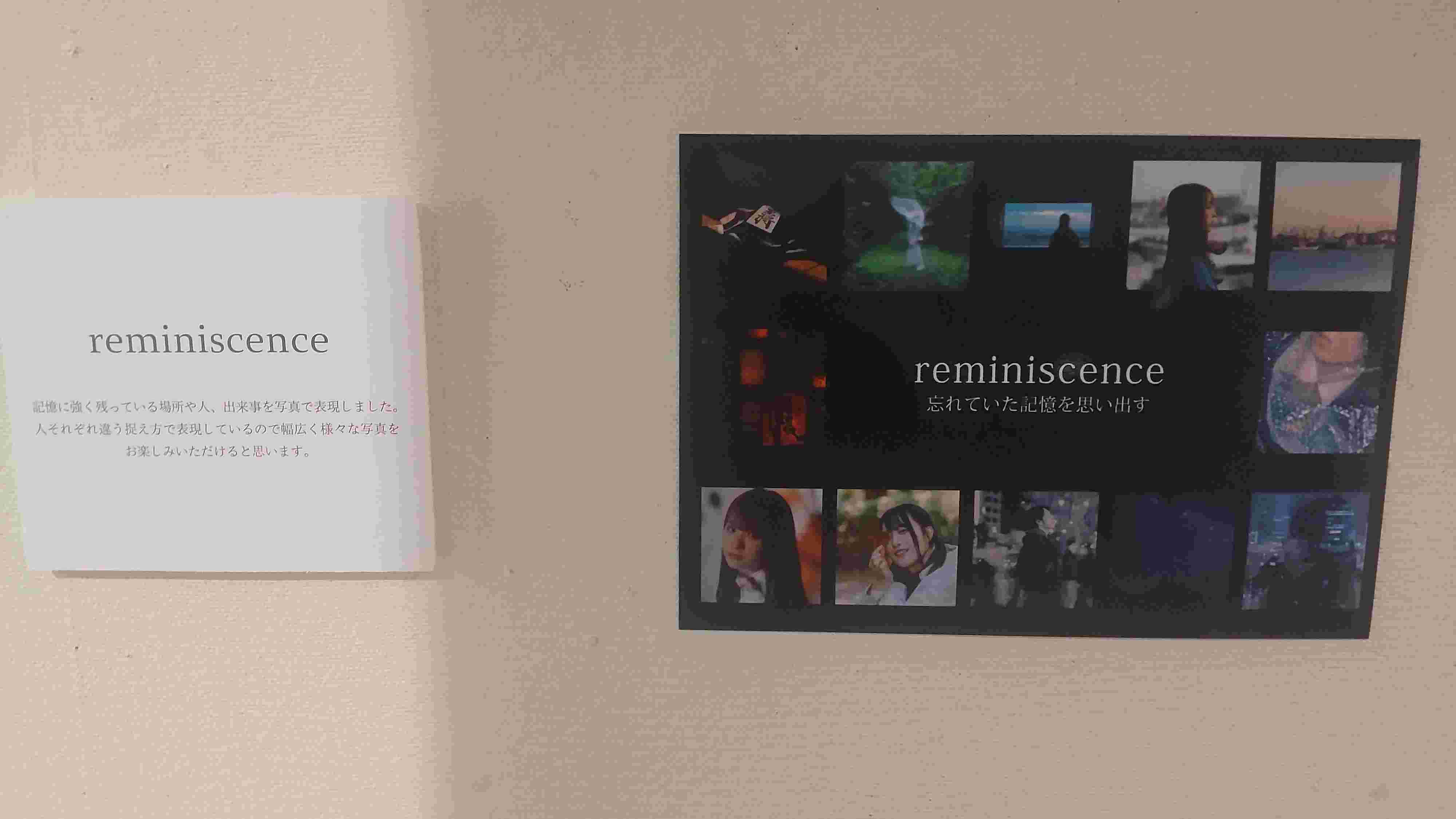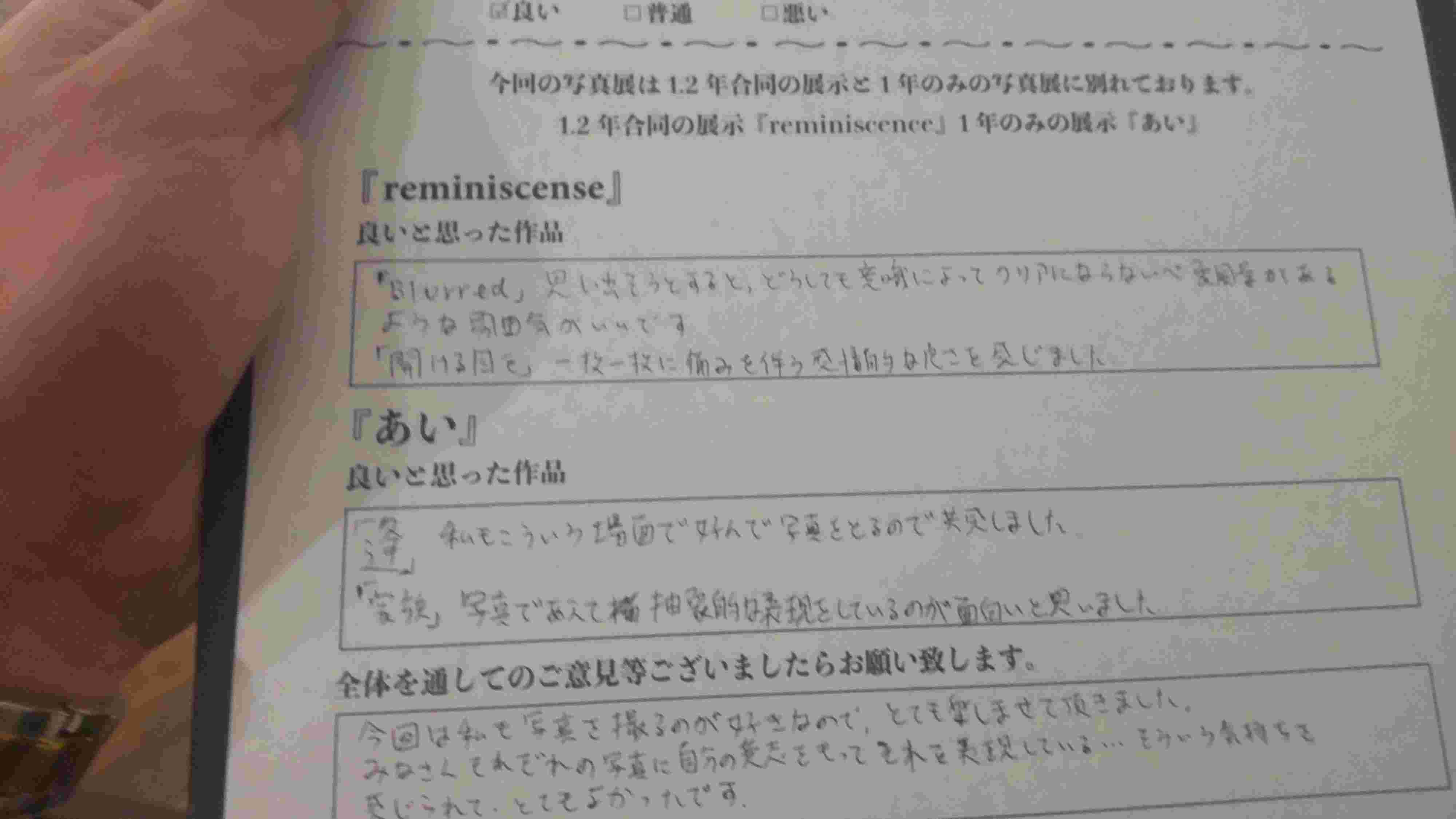 会場は2ブロックに分かれていて、ひとつは1/2年生の合同展 ”reminiscence”で、もうひとつは1年生による『それぞれの「あい」が集う写真展』という内容でした。私が行った時には雰囲気のある若きアーティスト然とした青年が熱心に写真に見入っていたので、私も静かに眺め、真摯に感想をアンケート用紙に書いてきました。なおこの時は仕事帰りだったので男性の格好で行ったことを念のため書いておきます。