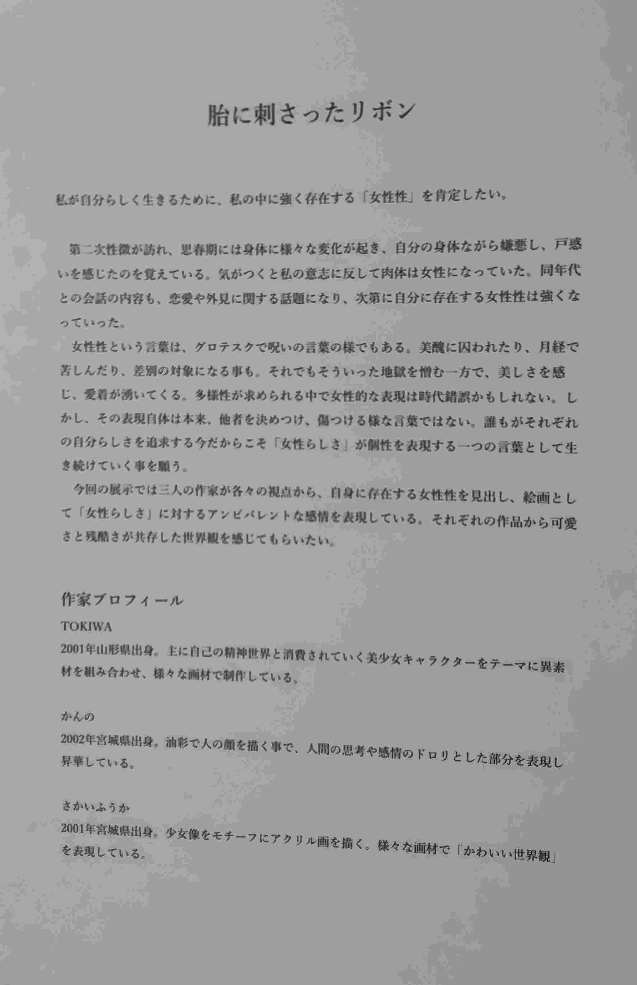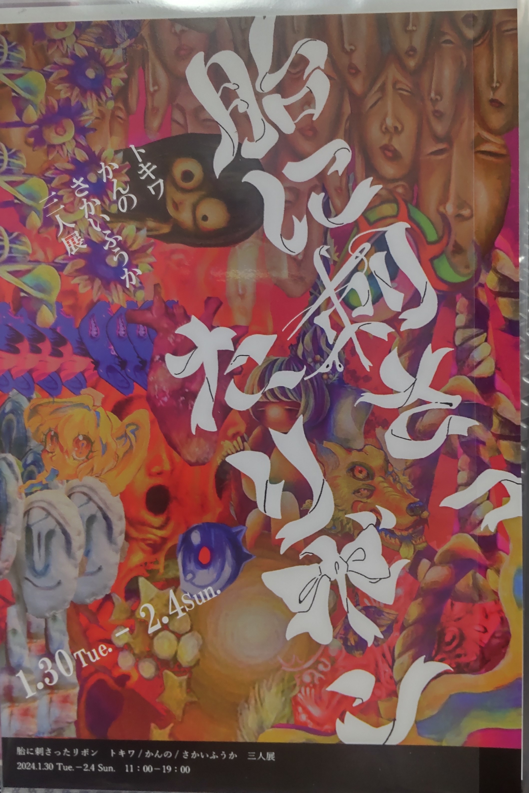 2月2日と3日に仙台アーティストランプレイス(SARP)で見た「かんの」さん「トキワ」さん「さかいふうか」さんによる三人展『胎に刺さったリボン』は、私にとっては非常に重大な出会いでした。2022年11月に同じ場所で見た「わたし、にしかみえない星」展に次ぐ衝撃を受けました。