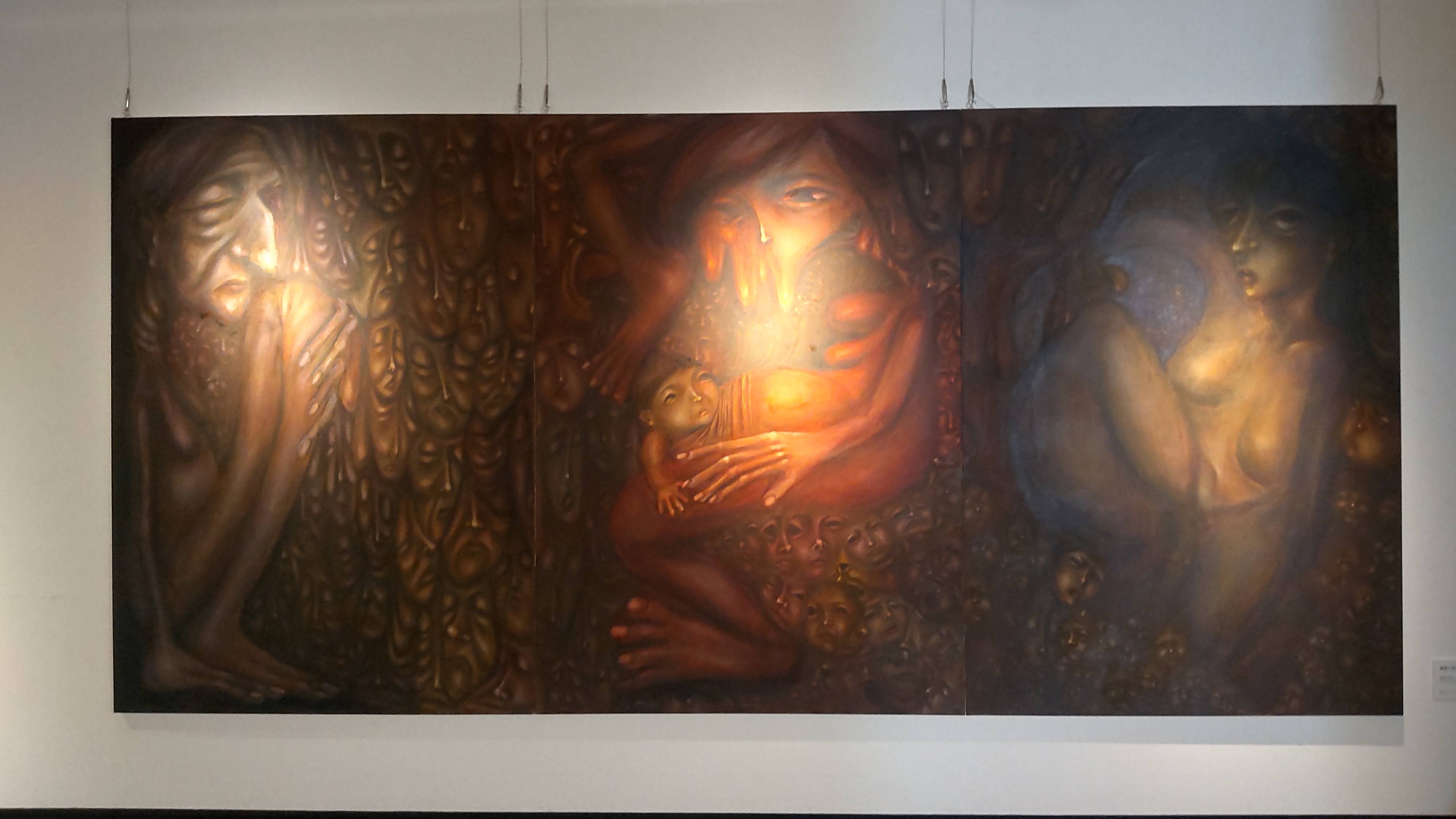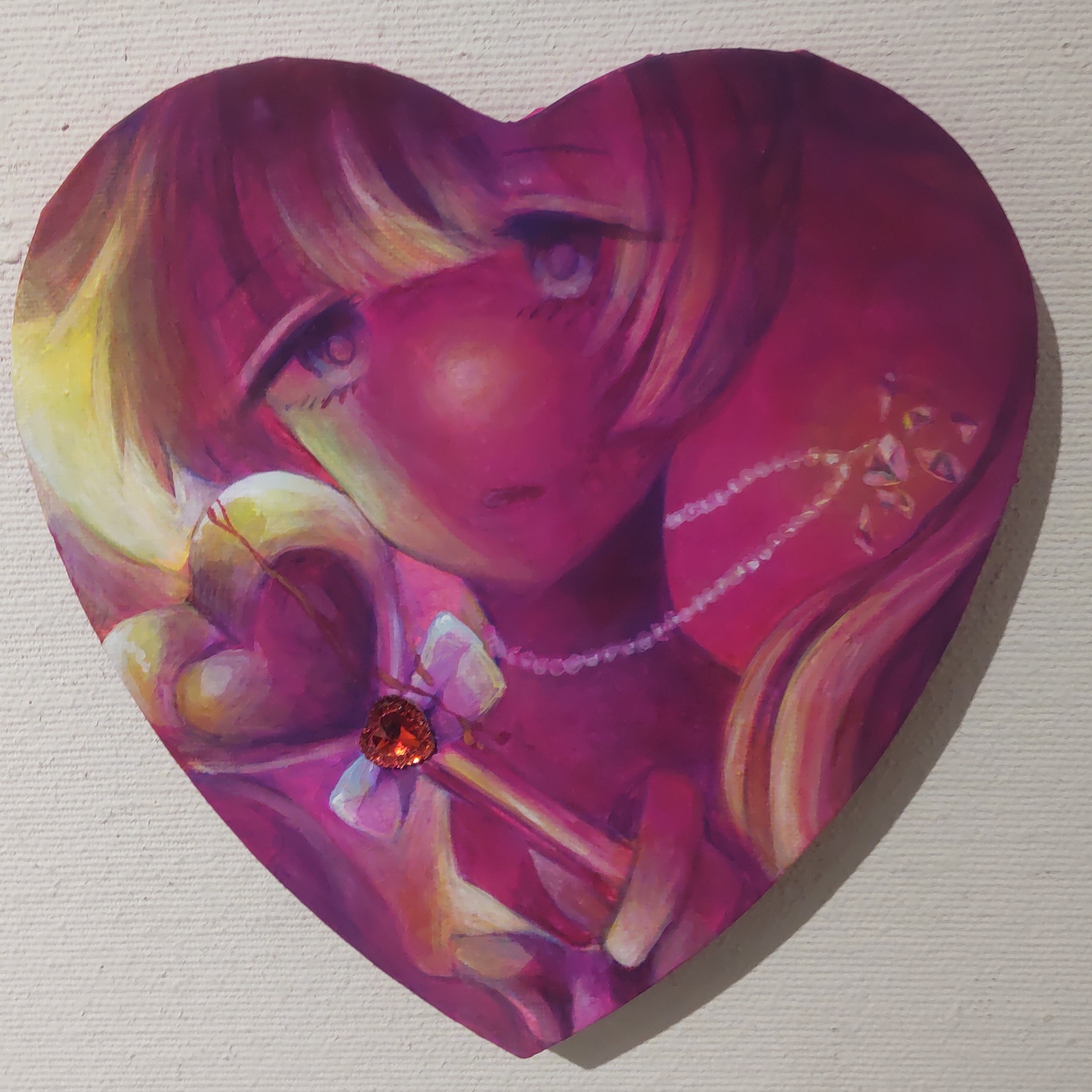 さかいふうかさんの作品から感じたのは「幻想」から入る女性性でした。ピンクやマゼンタという色合いには、なぜか女性のイメージが連想されます。それがベースの温かい……たぶん、その色合いに加えて人物の中心や周囲に光があるからなのかな……光の中に浮かぶ女性のヴィジョンは、率直に言ってとても可愛らしいと思うのです。それと同時に、その切ない表情から「内包している悲しみ」があるように感じました。ただただ可愛いだけならそれでおしまいですが、それだけでない生々しさ(=感情、人間らしさ)があるので、どんどん心の中に「可愛さ」という肯定的感情があふれてきます。そして心が「可愛さ」で満たされた時、ようやく私は絵の前から離れることができたのでした。