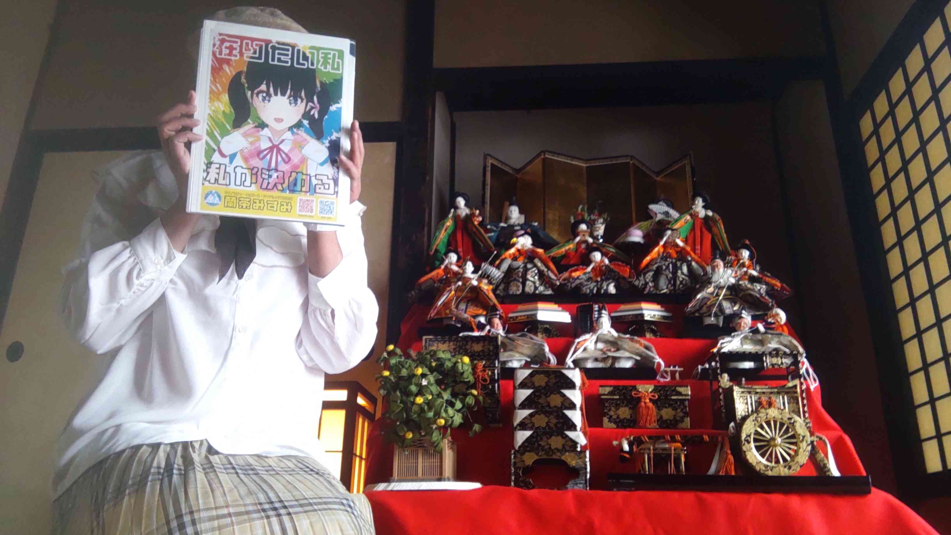 最近の話ですと、白石市に旅行した時に武家屋敷でひな人形を見てきました。最近は時流によりひな人形の世界でも核家族化? したのか、こういう多段階のひな飾りも見なくなりましたが、これこそひな飾り! ですよね。そんなひな飾りの横で私とみすみんサンがフュージョンした可愛らしい写真が撮れました。馬子にも衣裳にみすみんボード……。