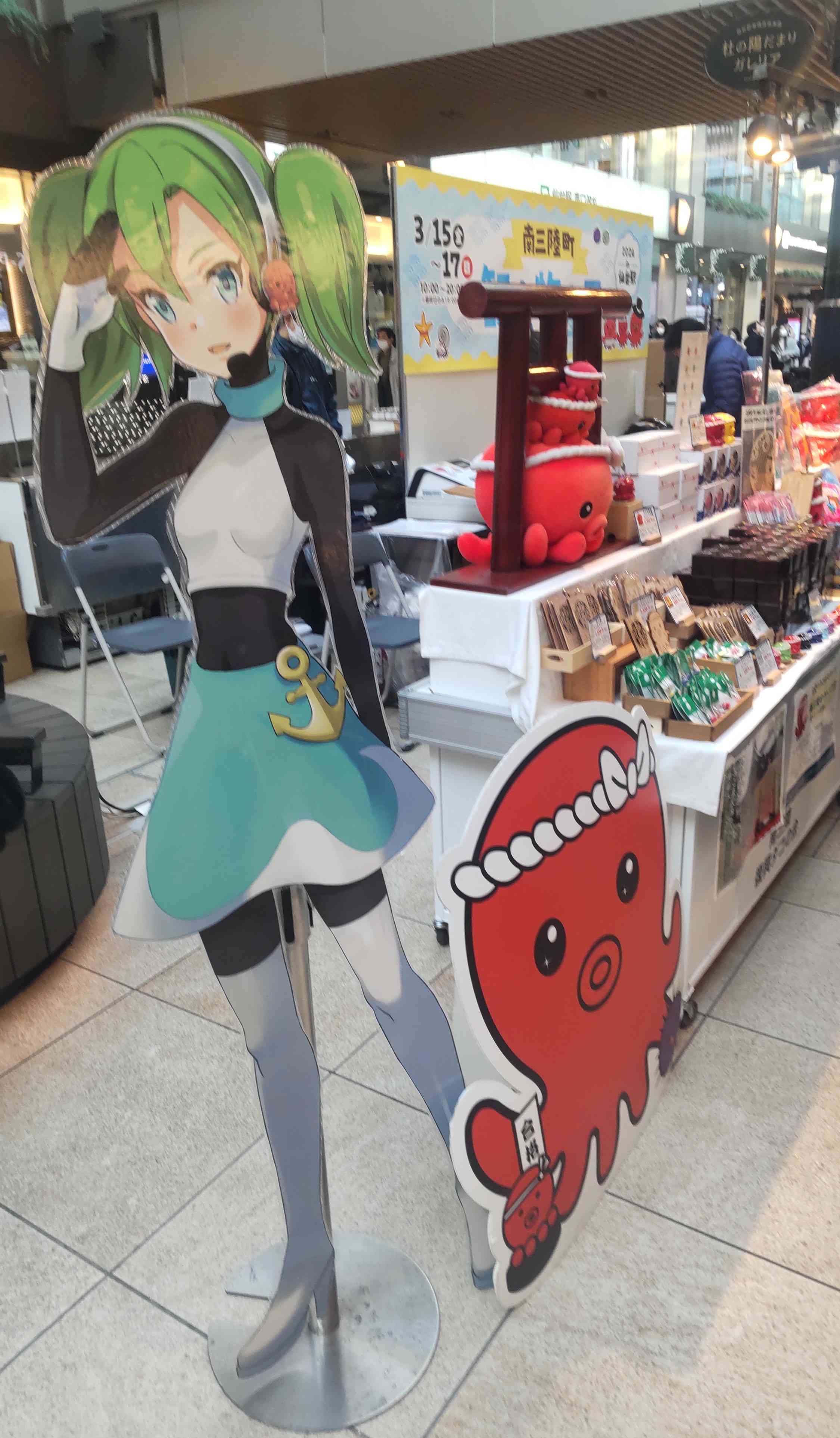 そんな感じで巡り巡って仙台駅東口に戻ってきたところ、東西自由通路(愛称『杜の陽だまりガレリア』)で南三陸町の物産展をやっていました。これから飲み会に行くのに南三陸の地酒とか買っていったらややこしいことになりかねないので、特に買い物はせず、その代わり物販ブースは端から端まで眺めてきました。そんな中で出くわしたのが……オクトパス君は知っていますが、この子は初めてみましたね。こないだ白石市に旅行に行った時も、見目麗しいアニメチックな女の子が街のいたるところに貼りだされていましたが……うん、可愛いです。可愛いと思います。南三陸はちょっと遠いですが、何度もオートバイで行ったお気に入りの場所ですからね。今回はスタンプラリーの台紙もいただいたことですし。今年も行きますよ~!