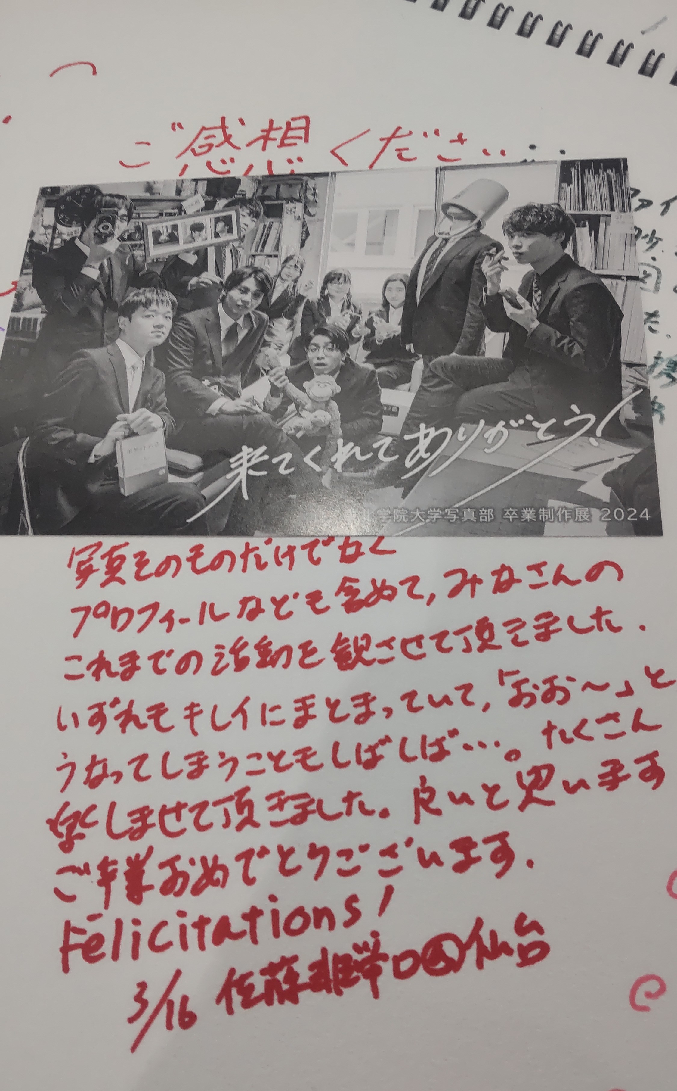こちらは在学生による写真展の感想でしたが、一方の卒展の方は特にアンケート用紙を渡されることはありませんでした。その代わり大きなスケッチブックがドン! とあって、そこに感想を書きこんでください! とあったので、個人的な思い(※)を込めて書いてきました。