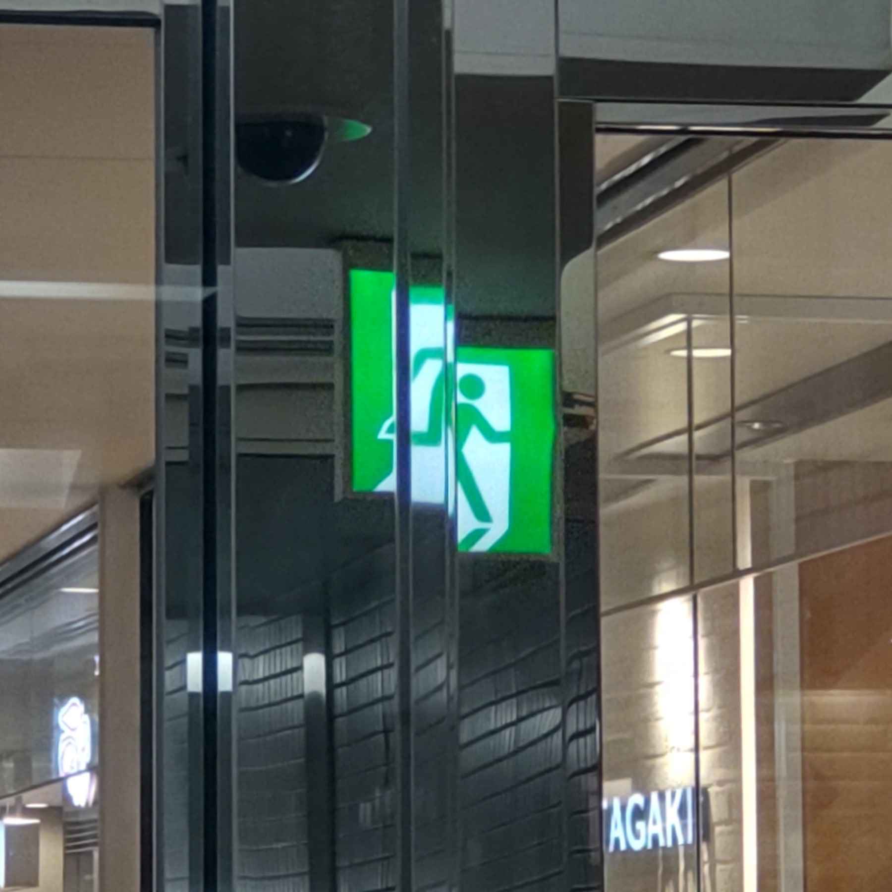 まず1枚目は仙台駅地下東西自由通路で撮影したものです。特別な場所ではありません。日夜多くの人が仙台駅東口と西口、特に仙台市地下鉄の北改札に直結しているので、仙台駅東口から地下鉄に乗る人は良く利用しているでしょう。私も通勤時は必ずここを通ります。その一部、ちょっと鏡っぽくなった枠に写った毎度おなじみ非常口マーク……個人的には、もう私のパーソナルマークと言ってもいいんじゃないかってくらい馴染んでしまって、また気にかけてしまうのですが……それが、こんな感じで分裂して見えたんですね。