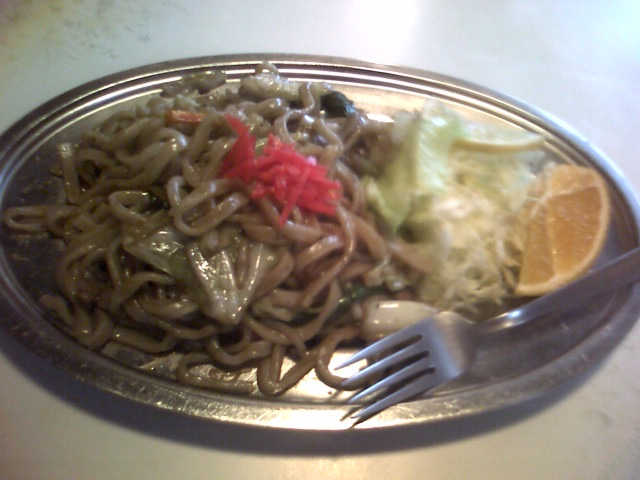 メニューはお寿司からラーメンまで、かなりすさまじいバリエーション。ココスと正面切ってぶつかっても一歩も引きません。事前に食券を買うシステムなので、ツカツカとレジまで行き、『ソース焼きうどん』(600円)をオーダー。私が行った時は1時過ぎと言うこともあってか、静かな雰囲気でした(トラックの運転手さんとか、通りすがりのオジサンオバサンとかが数名いた程度)。